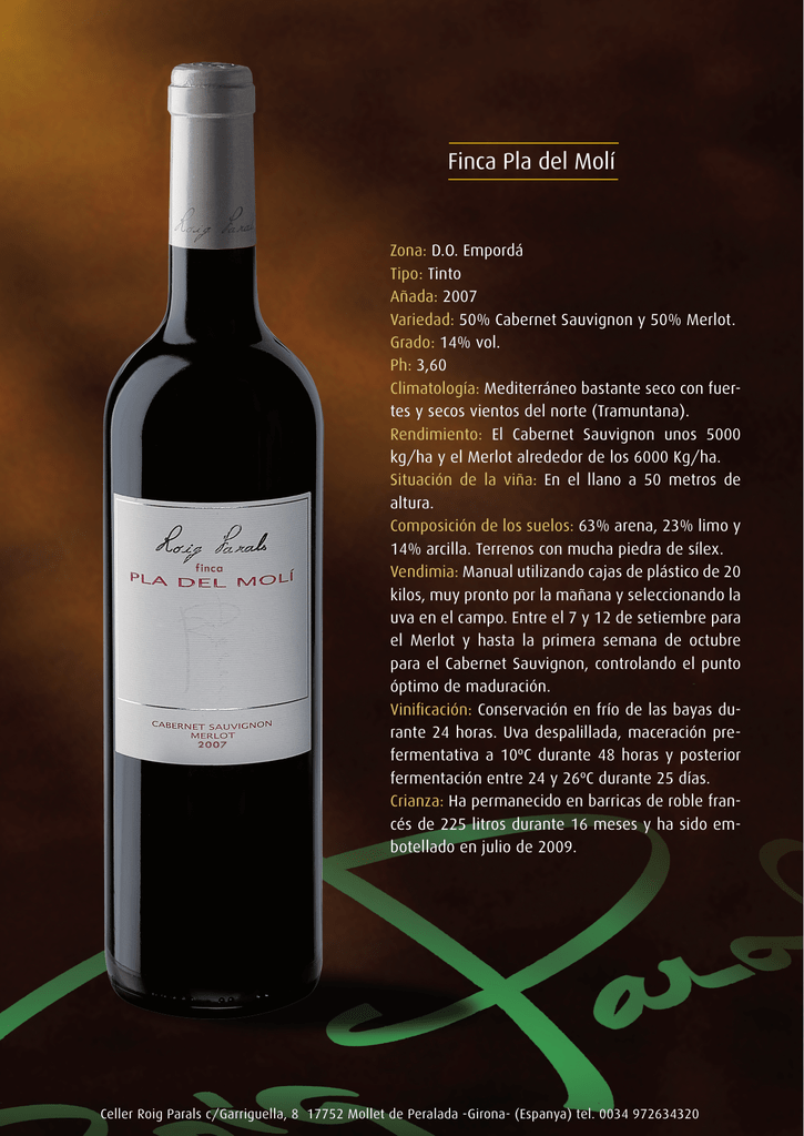 Finca Pla del Molí Zona: D.O. Empordá Tipo: Tinto Añada: 2007 Variedad: 50% Cabernet Sauvignon y 50% Merlot. Grado: 14% vol. Ph: 3,60 Climatología: Mediterráneo bastante seco con fuertes y secos vientos del norte (Tramuntana). Rendimiento: El Cabernet Sauvignon unos 5000 kg/ha y el Merlot alrededor de los 6000 Kg/ha. Situación de la viña: En el llano a 50 metros de altura. Composición de los suelos: 63% arena, 23% limo y 14% arcilla. Terrenos con mucha piedra de sílex. Vendimia: Manual utilizando cajas de plástico de 20 kilos, muy pronto por la mañana y seleccionando la uva en el campo. Entre el 7 y 12 de setiembre para el Merlot y hasta la primera semana de octubre para el Cabernet Sauvignon, controlando el punto óptimo de maduración. Vinificación: Conservación en frío de las bayas durante 24 horas. Uva despalillada, maceración prefermentativa a 10ºC durante 48 horas y posterior fermentación entre 24 y 26ºC durante 25 días. Crianza: Ha permanecido en barricas de roble francés de 225 litros durante 16 meses y ha sido embotellado en julio de 2009. Celler Roig Parals c/Garriguella, 8 17752 Mollet de Peralada -Girona- (Espanya) tel. 0034 972634320