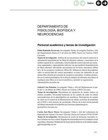 Índice DEPARTAMENTO DE FISIOLOGÍA, BIOFÍSICA Y NEUROCIENCIAS Personal académico y temas de investigación Pablo Rudomín Zevnovaty. Investigador Titular, Investigador Emérito y Jefe del Departamento (hasta el 31 de enero de 2000). Doctor en Ciencias (1965) Cinvestav. Temas de investigación: Análisis de los mecanismos del control central de la información transmitida por las fibras de aferentes cutáneos y musculares en la médula espinal de los vertebrados. Selectividad del control ejercido por estructuras segmentales y supraespinales sobre las vías que median la despolarización de fibras aferentes individuales provenientes de los husos musculares (fibras Ia) y de los receptores tendinosos (fibras Ib). Influencias tónicas descendentes sobre la selectividad del control presináptico en pares de colaterales de una misma fibra aferente proveniente de receptores musculares. Cambios producidos en el control presináptico de la eficacia sináptica de aferentes musculares al machacar estas fibras en el nervio periférico y permitir su regeneración. [email protected] Gabriel Cota Peñuelas. Investigador Titular y Jefe del Departamento (a partir del 1o. de febrero de 2000). Doctor en Ciencias (1983) Cinvestav. Temas de investigación: Mecanismos de regulación de canales iónicos en células excitables. Diversidad molecular de los canales de sodio en células neuroendócrinas de la adenohipófisis de mamíferos. Participación de canales de calcio en el control de la diferenciación de células secretoras de prolactina por el NGF y otros factores de crecimiento. Efectos de la inervación posnatal del lóbulo intermedio de la hipófisis por neuronas dopaminérgicas. [email protected] Carlos José Beyer Flores. Investigador Titular y Jefe del Laboratorio de Reproducción Animal, Cinvestav-Tlaxcala. Doctor en Ciencias (1970) UNAM. Temas de investigación: Mecanismos de acción de hormonas esteroides sobre el sistema nervioso central. Regulación neuroendócrina de la conducta sexual masculina y femenina. Modulación de la percepción dolorosa en la médula espinal. [email protected] 229/1 Índice CINVESTAV Jorge Aceves Ruiz. Investigador Titular e Investigador Emérito. Doctor en Ciencias (1971) Cinvestav. Temas de investigación: Organización funcional de los ganglios basales y papel de la inervación dopaminérgica en el procesamiento de la información motora por los mismos. Modulación presináptica de la neurotransmisión (receptores dopaminérgicos, GABAérgicos, colinérgicos, histaminérgicos, serotoninérgicos, purinérgicos y peptidérgicos). [email protected] Victor Alemán Alemán. Investigador Titular. Doctor en Ciencias (1965) Duke University, EUA. Temas de investigación: La participación de la actividad colinérgica y glutamatérgica en hipocampo y corteza en un modelo de aprendizaje espacial y la activación de sus vías de señalización. Regulación por calcio de factores de transcripción y del proceso de alternative splicing en el núcleo de neuronas durante la activacion de algunas vias de señalización. Aislamiento, identificación, cultivo y transplante de células troncales (stem cells) a ratas con alteraciones o lesiones del sistema nervioso central. [email protected] José Antonio Arias Montaño. Investigador Titular. Doctor en Ciencias (1990) Cinvestav. Temas de investigación: Neurofarmacología de sistemas histaminérgicos en el sistema nervioso central. Modulación por receptores presinápticos de la síntesis y liberación de neurotransmisores. Señalización intracelular. Subtipos de receptores para neurotransmisores. Regulación de la actividad neuronal por segundos mensajeros. [email protected] Marcelino Cereijido Mattioli. Investigador Titular e Investigador Emérito. Doctor en Ciencias (1964) Universidad de Buenos Aires, Argentina. Temas de investigación: Fisiología celular y molecular de membranas epiteliales. Contactos intercelulares. Canales iónicos. Mecanismos de translocación de moléculas a través de membrana. Diferenciación. [email protected] Rubén Gerardo Contreras Patiño. Investigador Titular. Doctor en Ciencias (1991) Cinvestav. Temas de investigación: Adhesión y polaridad en células epitheliales. Expresión de la Na+,K+-ATPasa y los contactos celulares epiteliales y mecanismos de despegue celular. [email protected]. Rafael Cueva Rolón. Investigador Titular. Doctor en Ciencias (1992) Cinvestav. Temas de investigación: Caracterización de los mecanismos fisiológicos que producen analgesia por la estimulación del tracto genital. Efecto de las hormonas esteroides en la actividad del circuito anticonceptivo de la formación reticular bulbar. Estudio de los mecanismos espinales que median la eyaculación. Caracterización del efecto de la acetilcolina en el aumento de la potencia sexual en ratas macho. Recuperación del uso de la cochinilla como colorante natural. Aislamiento y purificación del ácido carmínico y lacas con uso industrial. José Rodolfo Delgado Lezama. Investigador Adjunto. Doctor en Ciencias (1995) Cinvestav. Temas de investigación: Participación de las propiedades intrínsecas de las motoneuronas espinales durante patrones motores cíclicos. Mecanismos que generan el potencial del dorso de la médula espinal y su relación con la inhibición presináptica. Participación de receptores del tipo GABAA, GABAB y metabotrópicos glutamatérgicos en la inhibición presináptica en la médula espinal. Distribución de canales de calcio en las motoneuronas. [email protected] Diego Ricardo Félix Grijalva. Investigador Titular. Doctor en Ciencias (1994) Cinvestav. Temas de investigación: Fisiología molecular de los canales de calcio sensibles al voltaje. [email protected] 230/2 Índice FISIOLOGÍA, BIOFÍSICA Y NEUROCIENCIAS Benjamín Florán Garduño. Investigador Titular. Doctor en Ciencias (1989) Cinvestav. Temas de investigación: Parkinson experimental. Receptores dopaminérgicos presinápticos. Interaciones 