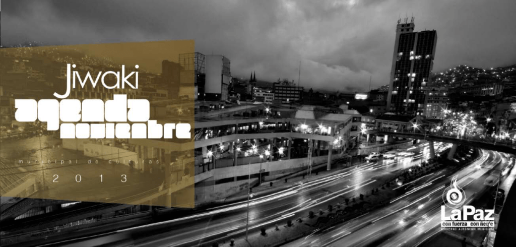 resentació Noviembre se abre con la festividad de Todos los Santos. En distintos espacios y barrios se realizarán exposiciones sobre las mesas de difuntos y otras costumbres, cuando los ajayus retornan para convivir con sus familiares vivos. Este mes se realizará la Bienal Internacional del Cartel BiCeBE, un encuentro que contiene actividades de jerarquía, como un congreso de diseño, simposios y talleres, con la participación de más de setenta trabajos de artistas de distintos países del mundo. Destaca Polonia como país invitado, además de la exposición de cien carteles en memoria de Vinicius de Moraes, al celebrar el centenario de su nacimiento. La programación de la Bienal SIART prosigue durante este mes, con distintas actividades. La primera versión de Diseñarte Bolivia merece nuestra atención por la variedad de conferencias, mientras la III Escénica Nacional congregará a elencos de teatro de casi todo el país. Walter Gómez Méndez OFICIAL MAYOR DE CULTURAS En materia de estrenos destaca el de la obra de teatro El silencio del Mar, del cineasta Marcos Loayza. Otra producción importante es el homenaje a Matilde Casazola y Jesús Durán por cantantes y músicos de reconocida trayectoria. El 30 de noviembre, la primera biblioteca pública del país, fundada por el presidente Andrés de Santa Cruz Calahumana, cumple 175 años de vigencia, con un programa de carácter académico, nuevos servicios y recepción de valiosos lotes de libros. La Revista Municipal de Culturas Jiwaki llega a su edición 50, cumpliendo 6 años de vigencia con reconocida calidad en sus contenidos y diseño. Nuestro afectuoso saludo a los hermanos del Beni, cuya efeméride se celebra el 18 de este mes. Que su temple y ánimo permitan alcanzar sus más altos anhelos de construir una sociedad y un país justo, basados en la dignidad y el respeto a sus determinaciones. TEATRO MUNICIPAL “ALBERTO SAAVEDRA PÉREZ” Jenaro Sanjinés esq. Indaburo - Telf. 2406133 - boletería 2406183 VIERNES 01 19:30 Hrs. EL CLON EN LA VERSIÓN DE ANDALUCÍA La conocida telenovela brasileña fue adaptada por Ingrid Gutiérrez, al género de la danza árabe. El espectáculo incluye coreografías de danza jazz, tango argentino y samba brasileña. Ref. 70192604. VIERNES DOMINGO 08 10 al 19:30 Hrs. EL SILENCIO DEL MAR Luis Bredow, Fernando Arze y Verónica Pérez protagonizan la puesta en escena de la obra teatral escrita y dirigida por Marcos Loayza. La obra relata la historia de personas distanciadas por valores y principios irreconciliables como si los separara un mar silencioso. Ref. 2431916. EL SILENCIO DEL MAR MARTES 12 19:30 Hrs. HOMENAJE A CASAZOLA Y DURÁN Teresa Morales y David Portillo unen su talento al de los grandes guitarristas, Oscar García y Gabriel Guzmán, para el homenaje a los cantautores Matilde Casazola y Jesús Durán. Ref. 71914676. MÍERCOLES EDITH EN JAZZ 19:30 Hrs. Conmemoración de los 50 años de la muerte de la mítica cantante francesa, Edith Piaf, con el concierto Edith en Jazz de Verónica Pérez. Acompañan a la intérprete renombrados músicos paceños de jazz. Ref. 2423660. 13 HOMENAJE A CASAZOLA Y DURÁN JUEVES VIERNES 14 15 y GUÍSELA SANTA CRUZ La cantante cruceña Hrs. retorna a La Paz para el recital que hará un repaso a sus mejores temas. Además presentará su nuevo disco Niña Camba, ...una historia de amor. Diferentes ritmos para alegrar las dos noches con la música folklórica del país. Ref. 725 54848. 19:30 SÁBADO TANGO CON ALTURA 19:30 Hrs. La tercera versión de este encuentro llega con música, canto y baile en vivo, a cargo de artistas nacionales e invitados de Uruguay y Argentina. Ref. 70533110. 16 DOMINGO 17 CANTANDO A SILVIO Espectáculo preparado por los dúos Entre dos Aguas y Negro y Blanco, y el grupo Los Escaramujos. El extenso programa incluirá una serie de temas del cantautor cubano, Silvio Rodriguez, en una noche de plena trova acompañada de imágenes del artista. Ref. 77274927. 19:30 Hrs. MARTES MIÉRCOLES 19 20 LA MUÑECA HADA 21 22 y El grupo Antología y una Big Band ofrecerán el espectáculo Boogie Nights, un ensamble que revivirá la onda Boogie de los años ’70 y ’80, acompañado de baile e imágenes que mostrarán la movida de las discotecas de esa época. Los artistas buscarán interactuar con el público. Ref. 77297138. 19:30 Hrs. MARIELA GONZÁLES DOMINGO SÁBADO 23 24 y 19:30 Hrs. BOOGIE NIGHTS y La Escuela de Danza del Ballet Oficial repondrá Hrs. una clásica obra de danza clásica estrenada en 1952 por Ileana Leonidoff, La Muñeca Hada. La propuesta se desarrolla en una tienda de juguetes cuyo propietario organiza un desfile de muñecos, entre ellos, Hada. Ref. 2406393. 19:30 VIERNES JUEVES ESTUDIO DANCE MARIELA GONZÁLES La experimentada bailarina y directora, Mariela Gonzáles, se presenta nuevamente en el Municipal, con su elenco titular y la obra Giselle. La producción artística del espectáculo fue realizada por Jaime Méndez. Ref. 2790016. MIÉRCOLES MARTES 26 27 y 19:30 Hrs. ACTUACIONES DE VICO VEGA El baladista Vico Vega ofrecerá recitales que recordarán sus cuatro décadas y media en el escenario. Acompañado por una orquesta y coro, interpretará lo mejor de su repertorio. Artistas invitados: Dante Uzquiano y Andrés Fosatty. Ref. 79555265. SÁBADO DOMINGO TEMPORADA DE ACOMPÁS DICIEMBRE La reconocida institución de baile español, dirigida por Yadir Vásquez, cerrará sus actividades del año con espectáculos de flamenco a cargo de la academia y la compañía. Homenaje al poeta Rafael Alberti. Ref. 70165323. 30 01 y 19:30 Hrs. ACOMPÁS TEATRO MUNICIPAL “MODESTA SANGINES” - Casa de la Cultura “Franz Tamayo” , Av. Mariscal Santa Cruz esq. Potosí. Telf. 2406877 VIERNES DOMINGO 01 03 y 16:00 y 19:30 Hrs. TIMÓN MAGIC Los personajes de las conocidas series Monster High y Plantas vs. Zombies serán llevados al escenario, en una representación teatral muy esperada por los niños. Ref. 79121216. TIMON MAGIC FUN MA