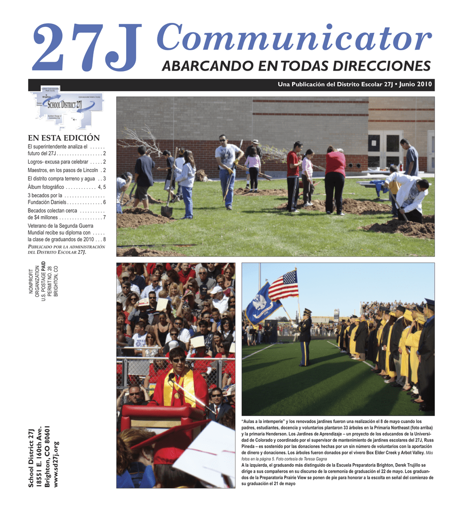 27J Communicator ABARCANDO EN TODAS DIRECCIONES Una Publicación del Distrito Escolar 27J • Junio 2010 EN ESTA EDICIÓN El superintendente analiza el . . . . . . futuro del 27J . . . . . . . . . . . . . . . . . . 2 Logros- excusa para celebrar . . . . . 2 Maestros, en los pasos de Lincoln . 2 El distrito compra terreno y agua . . 3 Álbum fotográfico . . . . . . . . . . . . 4, 5 3 becados por la . . . . . . . . . . . . . . . . Fundación Daniels . . . . . . . . . . . . . . 6 Becados colectan cerca . . . . . . . . . . de $4 millones . . . . . . . . . . . . . . . . . 7 Veterano de la Segunda Guerra Mundial recibe su diploma con . . . . . la clase de graduandos de 2010 . . . 8 School District 27J 18551 E. 160th Ave. Brighton, CO 80601 www.sd27j.org NONPROFIT ORGANIZATION U.S. POSTAGE PAID PERMIT NO. 28 BRIGHTON, CO PUBLICADO POR LA ADMINISTRACIÓN DEL DISTRITO ESCOLAR 27J. “Aulas a la intemperie” y los renovados jardines fueron una realización el 8 de mayo cuando los padres, estudiantes, docencia y voluntarios plantaron 33 árboles en la Primaria Northeast (foto arriba) y la primaria Henderson. Los Jardines de Aprendizaje – un proyecto de los educandos de la Universidad de Colorado y coordinado por el supervisor de mantenimiento de jardines escolares del 27J, Russ Pineda – es sostenido por las donaciones hechas por un sin número de voluntarios con la aportación de dinero y donaciones. Los árboles fueron donados por el vivero Box Elder Creek y Arbot Valley. Más fotos en la página 5. Foto cortesía de Teresa Gagna A la izquierda, el graduando más distinguido de la Escuela Preparatoria Brighton, Derek Trujillo se dirige a sus compañeros en su discurso de la ceremonia de graduación el 22 de mayo. Los graduandos de la Preparatoria Prairie View se ponen de pie para honorar a la escolta en señal del comienzo de su graduación el 21 de mayo 2 Mensaje del superintendente www.sd27j.org Logros, excusa para celebrar ¡C elebre! Esta edición del 27J Communicator es una celebración de los logros obtenidos. El distrito escolar exitosamente les ha dado la transición a más de 600 alumnos del duodécimo grado al mundo después de sus estudios en la preparatoria. Algunos de los graduandos ahora se preparan para la universidad, y otros para el mundo del trabajo. Cada uno ha alcanzado y ha pasado la meta que mejor los prepara para alcanzar sus objetivos para el futuro. Las graduaciones de la Preparatoria Brighton y la Preparatoria Prairie View fueron remarcablemente inusuales, casi únicas. El viernes, 21 de mayo, John Banks ocupó la silla de su hijo, Calvin James Banks, quien no puedo asistir a su graduación debido a que ya estaba sirviendo en la Armada de los Estados Unidos en Afganistán. John usó la capa y gorro de Calvin, se sentó con sus compañeros y aceptó el diploma en representación de su hijo. En BHS el sábado, 22 de mayo, Rueben Ayala, de 85 años de edad, recibió su diploma de la preparatoria, el evento que se perdió hace más de 65 años cuando tuvo que dejar sus estu- Dr. Blunck dios para servir en la Armada de los Estados Unidos durante la Guerra Mundial II. La oportunidad de recibir el diploma fue ofrecida de parte del programa Operation Recognition (lea la historia en esta edición) y adoptada por la docencia de BHS. Usted puede leer toda la historia del Sr. Ayala, según la cuenta Nick Ward, estudiante de periodismo en BHS. También en esta edición usted celebrará la finalización de cursos y leerá la historia de los ganadores de becas. Aproximadamente 200 alumnos del doce grado fueron becados con una cantidad aproximada de más de 3.5 millones de dólares en becas. Una lista de los estudiantes que recibieron becas y nos informaron de ellas está incluida en esta edición De todos los graduandos, tres de ellos recibieron la beca de la Fundación Daniels, la beca es con todos los gastos pagados a cualquier universidad que el estudiante desee asistir. Dos maestros del 27J se sumergirán a la vida de Abraham Lincoln este verano, al asistir a un taller educativo de cinco días en Springfield, Illinois. Con otro año de logros registrado en la historia, es tiempo de celebrar. En agosto un nuevo grupo de alumnos estará en el doce grado. Por otro lado, y dentro de otro espectro, otro grupo de pequeños de kínder comenzará su carrera educativa. La magnitud de la responsabilidad es bastante para darnos una pequeña pausa. 27J Communicator • Junio 2010 Miembros de su Mesa Directiva de Educación Joan Kniss Russ Carr Brian Madison Kristi Crisman Presidenta Distrito 4 Distrito 1 Vice Presidente Distrito 3 Distrito 2 Maestros caminan sobre las huellas de Lincoln D os maestros del Distrito Escolar 27J participarán en un grupo élite con otros 50 maestros que recibieron la beca de investigación de parte de Horace Mann-Abraham Lincoln. “Existe una situación única en el Distrito Escolar 27J,” dijo Sandy McCollum de la corporación educativa Horace Mann. “Cada año les concedemos este premio a 50 educadores a escala nacional,” ella le dijo al Superintendente, Dr. Rod Blunck. “Este año, por primera vez, tenemos a tres destinatarios de Colorado, dos de ellos pertenecientes a su distrito. Esto expresa la magnitud de la calidad de sus maestros.” Los ganadores del Distrito 27J son Lauryn Mascarenaz, maestra de la Escuela Primaria Pennock, y Elizabeth Sedalnick, maestra de la Escuela Preparatoria Brighton. “Estamos orgullosos de la iniciativa y el triunfante modelo que los maestros compartirán con sus colegas y sus estudiantes,” igualmente expresó el Superintendente de las Escuelas, Dr. Rod L. Blunck. “Nuestros estudiantes son bien servidos por maestros como Elizabeth y Lauryn quiénes se toman su tiempo para mejorar su propia educación y de esta manera ellos pueden enriquecer la experiencia educativa en sus propias aulas.” La beca de investigación es un programa de cinco días que será este verano y es patrocinado por Horace Mann, la Biblioteca