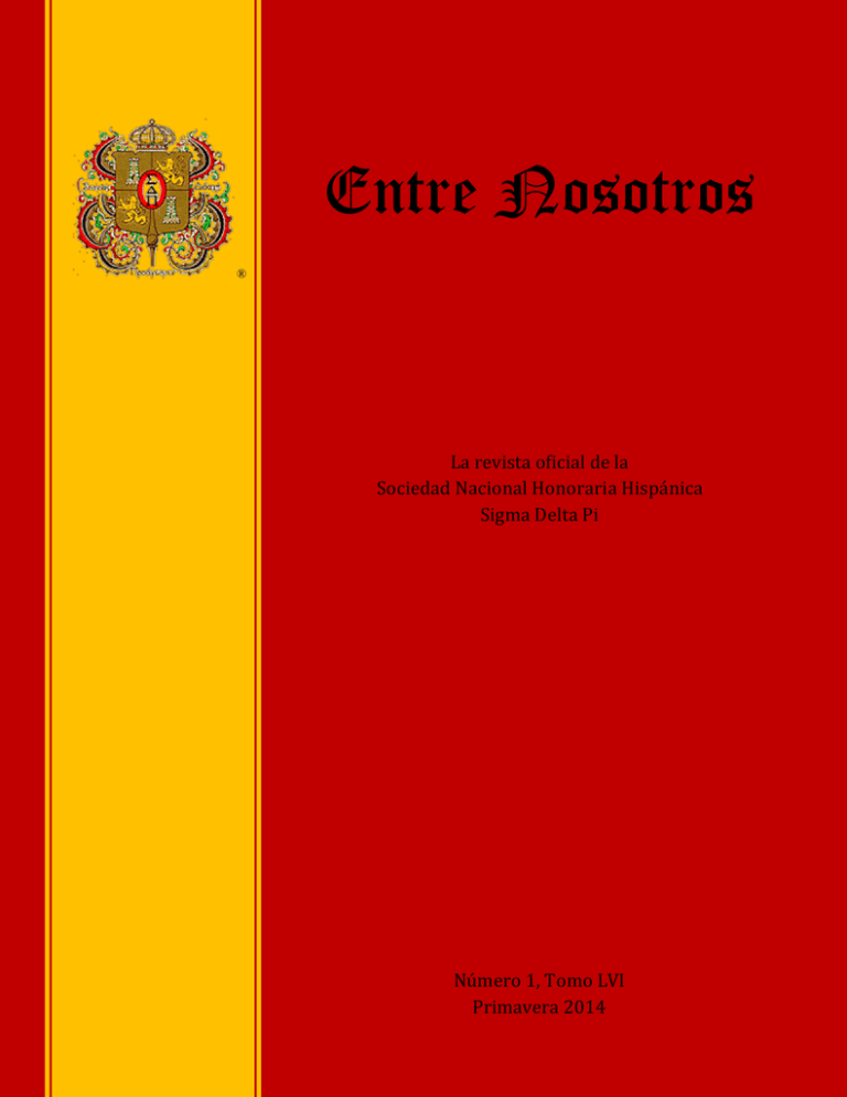 Entre Nosotros ® La revista oficial de la Sociedad Nacional Honoraria Hispánica Sigma Delta Pi Número 1, Tomo LVI Primavera 2014 EN * Para publicar sus noticias capitulares, fotos (en formato JPG, mínimo de 640 x 480 píxeles) y otra información sobre en nuestra próxima edición (primavera 2015), favor de mandarlas en español antes del 1 de noviembre de 2014 por correo electrónico a Mark P. Del Mastro, Director de Entre Nosotros, a la siguiente dirección: [email protected] Reservamos el derecho de modificar, corregir y suprimir cualquier aspecto de las noticias, ensayos y fotos que se publican en Entre Nosotros. Les agradecemos su colaboración. Como siempre, invitamos sus sugerencias para la continua mejora de la revista. * , National Collegiate Hispanic Honor Society, is a non-profit organization incorporated in the State of South Carolina, headquartered at the College of Charleston, a member of the Association of College Honor Societies, and affiliated with the American Association of Teachers of Spanish and Portuguese and the North American Academy of the Spanish Language. was founded at the University of California, Berkeley in 1919. Entre Nosotros La revista oficial de la Sociedad Nacional Honoraria Hispánica Sigma Delta Pi ________________________________________________________ Número 1, Tomo LVI Primavera 2014 DIRECTOR, EN Mark P. Del Mastro, The College of Charleston [email protected] REDACTORAS, EN Melinda S. Del Mastro, Sede [email protected] Graciela Tissera, Clemson University [email protected] PRESIDENTA Lucy F. Lee, Truman State University [email protected] EX PRESIDENTE y PRESIDENTE EMÉRITO Germán D. Carrillo, Marquette University [email protected] PRESIDENTE EMÉRITO John H. LaPrade, Southern Methodist University [email protected] VICEPRESIDENTES REGIONALES (2007-10) Marie-Lise Gazarian, St. John's University (noreste) [email protected] Maria R. Rippon, Furman University (sudeste) [email protected] Elizabeth Amaya, Millikin University (oeste medio) [email protected] 1 Comfort Pratt, Texas Tech University (sudoeste) [email protected] Marcela Rojas, Azusa Pacific University (oeste) [email protected] PRESIDENTES HONORARIOS Susan Carvalho, University of Kentucky James Ray Chatham, Mississippi State University Domnita Dumitrescu, California State University, Los Angeles Gerardo Piña-Rosales, Lehman College, CUNY DIRECTOR EJECUTIVO Mark P. Del Mastro [email protected] * www.sigmadeltapi.org * La redacción de EN se reserva el derecho de modificar, corregir y suprimir cualquier aspecto de las obras que se entregan a la publicación para asegurar la calidad y estética excelentes de la revista. 2 Índice Reflexiones de la Presidenta................................................................... Servicio distinguido................................................................................ Premio Minaya Álvar Fáñez.................................................................. Premio Ignacio y Sophie Galbis.............................................................. Premio Fénix............................................................................................ Premio Frida Kahlo............................................................................... Premio Octavio Paz……………………………………………......………… Capítulos de Honor y Mérito................................................................... Premio José Martel……………………………………………......…………. Subvenciones de proyectos capitulares................................................... Reseñas capitulares................................................................................. Premio Gabriela Mistral......................................................................... Premio Mario Vargas Llosa.................................................................... Jurado del Concurso de Becas................................................................ Ganadores de becas................................................................................. Ensayos de los becarios........................................................................... Jurado del Concurso de Becas para Investigaciones Graduadas.......... Ensayos de las becarias para investigaciones graduadas...................... Premio Jorge Luis Borges……………………………………………....…… La Orden de los Descubridores............................................................... La Orden de Don Quijote........................................................................ 3 4 7 7 8 8 8 9 10 12 13 14 47 48 49 50 51 71 72 76 77 78 Reflexiones de la Presidenta Muy apreciados amigos de Sigma Delta Pi, Me da gran placer poder aprovechar esta oportunidad para saludar por primera vez desde las páginas de esta insigne publicación a los muchos socios estudiantiles, consejeros capitulares y amigos que han contribuido al éxito de Sigma Delta Pi durante el último año. Esta nueva edición de Entre Nosotros, que sale el mismo año en que celebramos 95 años como Sociedad, marca un hito en la historia de nuestra organización. Como ya habrán notado, la exquisita prosa cervantina que embellecía esta página de reflexiones durante la presidencia de nuestro querido Presidente Emérito, Germán D. Carrillo, ha sido reemplazada por una voz mucho más llana, pero igualmente entusiasta y sincera en su devoción a todos los valores representados por esta sociedad. Antes de iniciar mi recuento de los logros del año pasado y mi visión del futuro, quisiera agradecerle de todo corazón a Germán Carrillo, su encomiable labor. Su liderazgo y total dedicación a esta organización a lo largo de los últimos catorce años no sólo aseguraron el éxito pasado de Sigma Delta Pi sino que han establecido los cimientos sobre los cuales la sociedad de Ruth Barnes seguirá prosperando más allá de su centenario, que se celebrará en só