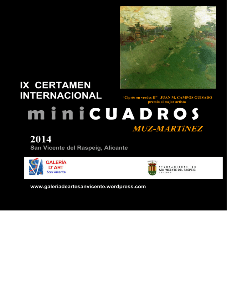 IX CERTAMEN INTERNACIONAL “Ciprés en verdes II” JUAN M. CAMPOS GUISADO premio al mejor artista miniCUADROS MUZ-MARTíNEZ 2014 San Vicente del Raspeig, Alicante www.galeriadeartesanvicente.wordpress.com La Galería D´Art San Vicente, fue fundada en 1998 por el Artista Muz-Martínez con un claro compromiso, mostrar a la sociedad las distintas tendencias artísticas y servir de plataforma para artistas emergentes. Nos orgullecer el estar una vez mas contribuyendo a fortalecer nuestros vínculos con el arte actual y sus artistas de todo el mundo, con este certamen a nivel internacional, patrocinando este proyecto de minicuadros, para que anime a este colectivo de creadores en su escalada de nuevas metas., Hablar de minicuadros en San Vicente del Raspeig es hacerlo del estudio de pintura Muz Martínez y del certamen internacional que por novena edición consecutiva organiza para el deleite de las Bellas Artes. El arte en pequeño formato, curioso, imaginativo, genial, todo un ejercicio de concreción que a través de la pintura cobra interés especial. Este Certamen ya consolidado con su IX edición, nadie duda que seguirá dando beneficios a la cultura en nuestra ciudad y nos aportara el entusiasmo necesario, para continuar creciendo cada vez más con nuestra labor en beneficio de todos los que amamos el arte. El Ayuntamiento de San Vicente del Raspeig, a través de la concejalía de Cultura, reconoce el esfuerzo, la calidad y el gusto del maestro Muz Martínez en la organización de este evento, que trasciende nuestras fronteras y que es una referencia obligada dentro del mundo del arte en todo el territorio español. Saturnino Álvarez Concejal de cultura Agradecemos desde aquí, la colaboración inestimable de nuestro Excmo. Ayuntamiento representado por su Alcaldesa Sra. Luisa Pastor y el Concejal de Cultura D. Saturnino Álvarez, así como de las entidades y empresas, que con su aportación han hecho posible llevar a cabo este proyecto. Muz-Martínez Autor: MUZ-MARTÍNEZ Titulo: Diálogos de papel 3 Técnica: Mixta-Collage Medida: 24 X 24 ORGANIZACIÓN GALERÍA D´ART SAN VICENTE FOTOGRAFÍA Mº JOSE MUÑOZ @ DE LAS IMÁGENES LOS AUTORES EDITA CONCEJALIA DE CULTURA AYUNTAMIENO DE SAN VICENE DEL RASPEIG IMPRESIÓN Y DISEÑO GRAFICAS MESA, S.L. @DE LOS TEXTOS LOS AUTORES ACTA DEL JURADO En San Vicente del Raspeig, a 24 Noviembre de 2014 Constituido el jurado del IX CERTAMEN INTERNACIONAL DE MINICUADROS “MUZMARTÍNEZ, en la Galería de Arte San Vicente, sito en C/ Echegaray, 12, bajo la intervención y actuación del Sr. Juan Muñoz en calidad de secretario, se constituye el jurado compuesto por: D. DAYRA MADRONA, licenciada en bellas artes de la Facultad de San Carlos de Valencia, y artista plástico. D. JOSÉ ÁNGEL GRAN MORENO, licenciado en bellas artes y Director del PHACEC, (Agencia Valenciana para el desarrollo del patrimonio artístico y cultural) y profesor de la escuela de Arte y Superior de Diseño de Alicante. D. JOSÉLUÍS GONZÁLEZ MAGAÑA, Diplomado en bellas artes de la Facultad de San Carlos de Valencia, Licenciado en Psicología y Pedagogía en la universidad de valencia, Profesor en el I.E.S Las Lomas, Alicante y Artista plástico. Se procede por los mismos al examen de las 206 obras presentadas por los 128 artistas al concurso de la presente edición. De las que en una primera selección se extraen 100 y en una segunda selección quedan 55 obras para formar la exposición, a las que se suman las cinco obras seleccionadas de los alumnos de la escuela-taller de Pintura “MUZ-MARTÍNEZ” y sobre cuyo conjunto acuerdan proponer para la adquisición con el fondo disponible, 18 obras, a las cuales se acuerda concederles el titulo de finalistas, de las cuales finalmente se decide conceder premio de adquisición a las obras con los Nº 4-A, de la autora Elvira Rodríguez Roura, Nº 4-B, de la autora Elvira Rodríguez Roura, Nº 49-A, de la autor Alfredo Sarandeses Lizarazu, Nº 61-B, de la autora María José Lozano, Nº 106-A, del autora Marina Noguera Galindo, Nº 120-B del autor Yoshimar Tello Delgado. Así mismo tras la investigación de la trayectoria de los finalistas acuerdan conceder el premio especial al mejor artista dotado con una exposición individual en la Galería D´Art San Vicente a la obra Nº 115-B del autor Juan Manuel Campos Guisado. Firman de conformidad el contenido de la presente en unión del Sr. Secretario los miembros del jurado, en el lugar y fecha expresados al inicio de la presente ALUMNOS MENCIÓN HONORÍFICA ESCUELA DE PINTURA MUZ MARTÍNEZ 2º MENCIÓN HONORÍFICA 3º MENCIÓN HONORÍFICA Autor: TONO GARCIA Título: ATARDECER EN LA ORILLA Autor: EZEQUIEL MATEOS Título: 35.000 AÑOS 1º MENCION HONORÍFICA Autor: JOSE VICENTE PUERTA Título: ARROYO 4º MENCIÓN HONORÍFICA 5º MENCIÓN HONORÍFICA Autora: PAULA DIONIS Título: NIÑA EN EL JARDIN Autor: ERIK BENITO Título: TIBURON MOLON PREMIOS ADQUISICIÓN PREMIO ADQUISICIÓN PREMIO ADQUISICIÓN COMERCIO COLABORADOR GRUPO STYLAM PREMIO ADQUISICIÓN ASCENSORES DE PABLOS Autora: MARINA NOGUERA Título: EQUILIBRIO De: VALENCIA Autora: ELVIRA RODRIGUEZ Título: CHAMALEONTIS ACROBATICUS De: BARCELONA Autora: MARIA JOSE LOZANO Título: UN LUNES CUALQUIERA De: SEVILLA PREMIO ADQUISICION PREMIO ADQUISICION PREMIO ADQUISICION ASADOR AZORIN GRUPO STYLAM ASCENSORES DE PABLOS Autor: YOSHIMAR TELLO Título: AYOTZINAPA De: Tepic, Nayarit, MÉXICO Autora: ELVIRA RODRIGUEZ Título: CHAMALEONTIS DOMESTICUS De: BARCELONA Autor: ALFREDO SARANDESES Título: RUA DEL FRANCO De: A CORUÑA FINALISTAS Autora: ESTHER GAMEZ Título: DESDE MI VENTANA Autor: JUAN ARENAS Título: HOMEOSTASIS EN Autora: ANA CISCAR CEBRIA Título: THIS LAND IS YOUR LAND De: JAEN De: ALICANTE De: VALENCIA Autora: ANDREA RABAT ZAPICO Título: VERGEL DEL BARRIO De: TARRAGONA Autor: OLIVER PAZ PEREZ Título: CAMINO DE SAN FRANCISCO De: VALENCIA Autor: EMILIO CARDENAS Título: LUZ DE CAL II De: VALENCIA ORGANISMO FAMILIAR II FINALISTAS A