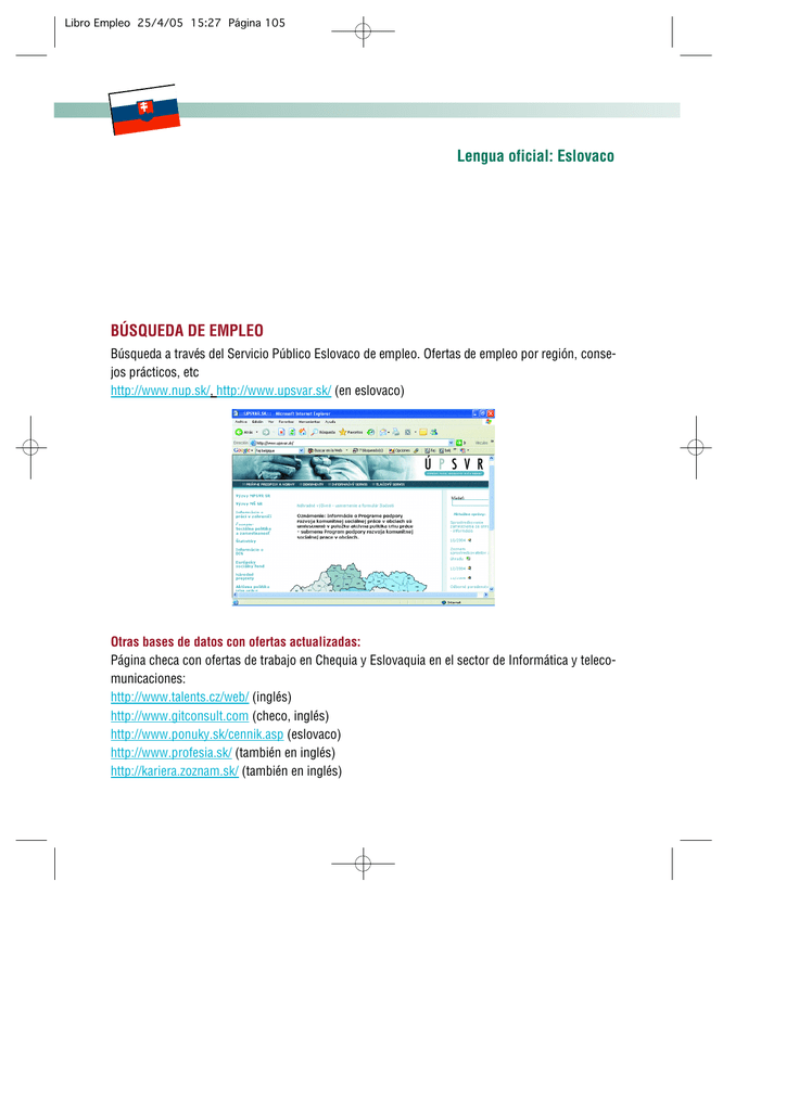 Libro Empleo 25/4/05 15:27 Página 105 Lengua oficial: Eslovaco BÚSQUEDA DE EMPLEO Búsqueda a través del Servicio Público Eslovaco de empleo. Ofertas de empleo por región, consejos prácticos, etc http://www.nup.sk/, http://www.upsvar.sk/ (en eslovaco) Otras bases de datos con ofertas actualizadas: Página checa con ofertas de trabajo en Chequia y Eslovaquia en el sector de Informática y telecomunicaciones: http://www.talents.cz/web/ (inglés) http://www.gitconsult.com (checo, inglés) http://www.ponuky.sk/cennik.asp (eslovaco) http://www.profesia.sk/ (también en inglés) http://kariera.zoznam.sk/ (también en inglés) Libro Empleo 25/4/05 15:27 Página 106 http://www.brigadnici.sk/, http://www.indexplus.cz/index_sk.html (trabajos temporales) http://www.studentservis.sk/brigady.html Student Servis. Trabajos temporales para estudiantes PRÁCTICAS AIESEC Slovakia: http://www.aiesec.sk/ http://www.10000stages.com/ (español y otros idiomas) http://www.kapstages.com (español y otros idiomas) TRABAJAR EN VACACIONES Trabajo en vacaciones en Eslovaquia y tambien en otros paises http://www.ckm.sk/buxus/generate_page.php?page_id=60 http://www.sapa.sk/wt/ Bases de datos con ofertas actualizadas http://www.indexplus.cz/index_sk.html http://www.brigadnici.sk/ Student Servis Trabajos temporales para estudiantes http://www.studentservis.sk/brigady.html Libro Empleo 25/4/05 15:27 Página 107 AU PAIR La mayoría de los siguientes sitios Web ofrecen estancias en varios paises además de Eslovaquia http://www.aupair-info.sk/pages/aupairkatalog.php http://www.interstudy.sk/index.php?page=132 http://www.lotty.sk/index.php?m=500 (en inglés y eslovaco) http://www.nomati.sk/main_menu.html http://www.yelloo.sk DIRECCIONES Y WEBS ÚTILES Información útil y ofertas de empleo http://www.eujobs.sk (en inglés y eslovaco) Estadisticas de empleo: http://www.statistics.sk/webdata/slov/tabulky/zam.htm Información sobre las empresas en Eslovaquia, datos económicos y de empleo por regiones http://www.ueos.sk/mvrr.sr/isvov/s6/m1/cata.05.htm Embajada de Eslovaquia Calle Pinar, 20 • 28006 - MADRID (ESPAÑA) Teléfonos: 915903861 - 915903967 Fax: 915903868 Libro Empleo 25/4/05 15:27 Página 108 Embajada de España en Eslovaquia Prepo_tská 10 • 81101 Bratislava Phone: 00421/2/54 41 57 24 Fax: 00421/2/54 41 75 65 E-mail: [email protected] [email protected] Periódicos: http://www.tasr.sk/ http://www.slovakia.org/features.htm Portales: http://www.best.sk/ http://www.slovakia.org/ Guía de Eslovaquia (inglés) Web del Gobierno: http://www.government.gov.sk/english/ (versión en inglés) Portal juvenil: http://www.mladez.sk (inglés, eslovaco) Centro de información juvenil Zdruzenie Informacnych a Poradenskych Centier Mladych - ZIPCeM c/o ICM-Radlinského 51 Tel.(421+7) 52.49.58.91 Fax.(421+7) 52.49.58.89 [email protected] Cámara de Comercio Central: http://www.scci.sk/ Cámara de Comercio e industria de Bratislava Jasikova 6, SK-82673 Bratislava, Tel: +421 2 48291257 Fax: +421 2 48291260 e-mail: [email protected] http://www.sopk.sk/ba/an/index.html Libro Empleo 25/4/05 15:27 Página 109 INFORMACIÓN TURÍSTICA http://www.travelguide.sk/ (en inglés, eslovaco, checo, alemán, húngaro y polaco) Oficina oficial de turismo: http://www.sacr.sk/ (en inglés, francés, eslovaco, checo, alemán, holandés, húngaro y polaco)