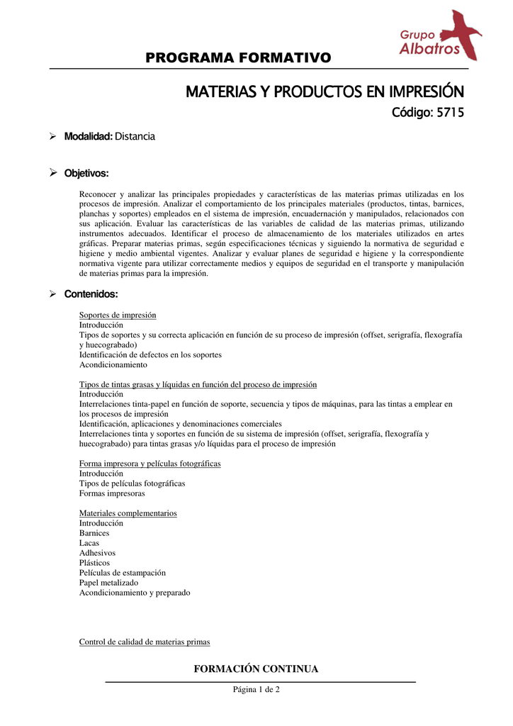 PROGRAMA FORMATIVO MATERIAS Y PRODUCTOS EN IMPRESIÓN Código: 5715 Modalidad: Distancia Objetivos: Reconocer y analizar las principales propiedades y características de las materias primas utilizadas en los procesos de impresión. Analizar el comportamiento de los principales materiales (productos, tintas, barnices, planchas y soportes) empleados en el sistema de impresión, encuadernación y manipulados, relacionados con sus aplicación. Evaluar las características de las variables de calidad de las materias primas, utilizando instrumentos adecuados. Identificar el proceso de almacenamiento de los materiales utilizados en artes gráficas. Preparar materias primas, según especificaciones técnicas y siguiendo la normativa de seguridad e higiene y medio ambiental vigentes. Analizar y evaluar planes de seguridad e higiene y la correspondiente normativa vigente para utilizar correctamente medios y equipos de seguridad en el transporte y manipulación de materias primas para la impresión. Contenidos: Soportes de impresión Introducción Tipos de soportes y su correcta aplicación en función de su proceso de impresión (offset, serigrafía, flexografía y huecograbado) Identificación de defectos en los soportes Acondicionamiento Tipos de tintas grasas y líquidas en función del proceso de impresión Introducción Interrelaciones tinta-papel en función de soporte, secuencia y tipos de máquinas, para las tintas a emplear en los procesos de impresión Identificación, aplicaciones y denominaciones comerciales Interrelaciones tinta y soportes en función de su sistema de impresión (offset, serigrafía, flexografía y huecograbado) para tintas grasas y/o líquidas para el proceso de impresión Forma impresora y películas fotográficas Introducción Tipos de películas fotográficas Formas impresoras Materiales complementarios Introducción Barnices Lacas Adhesivos Plásticos Películas de estampación Papel metalizado Acondicionamiento y preparado Control de calidad de materias primas FORMACIÓN CONTINUA Página 1 de 2 PROGRAMA FORMATIVO Introducción Proceso de control: sobre los materiales (soportes y tintas), control de la viscosidad, tiempos de secado, resistencia al frote y arañazos de barnices y lacas Procedimientos de inspección y recepción Equipos e instrumentos Normativas de calidad Calidades comerciales Normas de seguridad, salud y protección ambiental en la preparación de materiales para impresión Introducción Normas de seguridad y medioambientales en el transporte y manipulación de tintas, soportes, disolventes y consumibles para el proceso de producción y mantenimiento Dispositivos de seguridad y medioambientales en el transporte y manipulación de materiales: EPI, dispositivos de seguridad en elementos de transporte, recipientes especiales para almacenar residuos FORMACIÓN CONTINUA Página 2 de 2