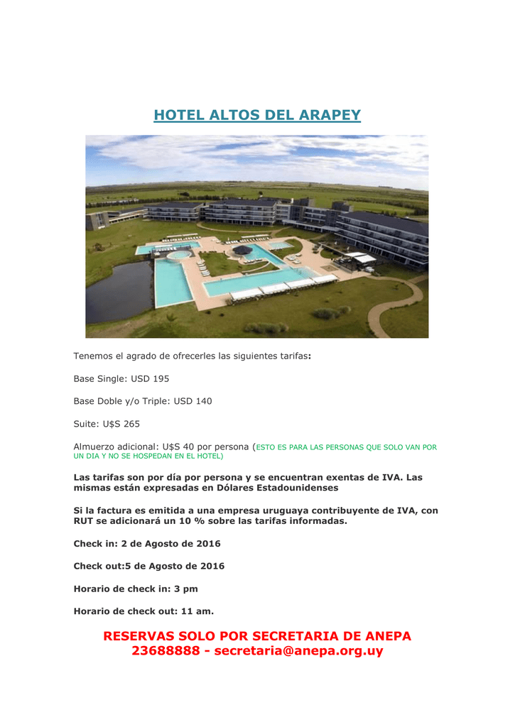 HOTEL ALTOS DEL ARAPEY Tenemos el agrado de ofrecerles las siguientes tarifas: Base Single: USD 195 Base Doble y/o Triple: USD 140 Suite: U$S 265 Almuerzo adicional: U$S 40 por persona (ESTO ES PARA LAS PERSONAS QUE SOLO VAN POR UN DIA Y NO SE HOSPEDAN EN EL HOTEL) Las tarifas son por día por persona y se encuentran exentas de IVA. Las mismas están expresadas en Dólares Estadounidenses Si la factura es emitida a una empresa uruguaya contribuyente de IVA, con RUT se adicionará un 10 % sobre las tarifas informadas. Check in: 2 de Agosto de 2016 Check out:5 de Agosto de 2016 Horario de check in: 3 pm Horario de check out: 11 am. RESERVAS SOLO POR SECRETARIA DE ANEPA 23688888 - [email protected] DESCRIPCION DE SERVICIOS : GASTRONOMIA Régimen de Alimentos y Bebidas ALL INCLUSIVE: Consistente en desayuno buffet, almuerzo buffet, un coffee break con masitas y productos dulces y cena buffet. Todas las bebidas nacionales, cocktails, vinos, etc. incluídas en el régimen. Almuerzos y cenas buffet, además de una gran variedad de entradas frías, incluyen 4 platos calientes y 4 estaciones de show cooking, en las cuales ofrecemos variedad de pastas y salsas, parrilla completa criolla, pescados y mariscos y un horno de pan para pizzas armadas según el gusto del cliente. Servicio Snack Bar y Deck Piscinas de 10:30 am a 00:00 am que ofrece servicio de snacks, cafetería, refrescos y bebidas. Servicio Wet Bar (Bar Mojado) de 11:00 am a 20:00 hrs, ofrece servicio de refrescos y bebidas AMENIDADES: Incluidas en la tarifa: Pozo propio de agua termal que nutre todo el hotel y seis piscinas al aire libre y dos piscinas cubiertas (temperatura del agua 39/40 grados y 150.000 litros/hora) Acceso a los Jacuzzi y al Sauna. Equipo de animación para adultos, adolescentes y niños con programas de entretenimiento durante todo el día. Sala de cine con pantalla gigante. Acceso al Gimnasio. Sala de lectura para adultos. Sala de juegos con mesa de ping pong, de billar y metegol. Kid´s club. Bicicletas, paseos en Jeep, Caminatas, birdwatching y campo de deportes. Se puede realizar con cargo: Tratamientos faciales, masajes especiales y tratamientos de la Dra. Aslan en nuestro Spa de primer nivel. Boutique de ropas y kiosko. Cancha de golf propia frente al hotel, 18 hoyos, par 72, 7.200 yardas. Excursiones de pesca al Rio Arapey.