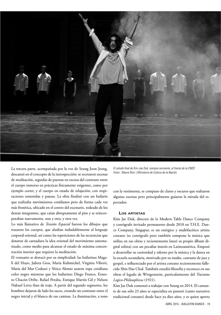 La tercera parte, acompañada por la voz de Seung Joon Jeong, descansó en el concepto de la introspección: se recrearon escenas de meditación, seguidas de puestas en escena del contraste entre el cuerpo inmerso en prácticas físicamente exigentes, como por ejemplo correr, y el cuerpo en estado de relajación, con respiraciones sostenidas y pausas. La obra finalizó con un bailarín que realizaba movimientos cotidianos pero de forma cada vez más frenética, ubicado en el centro del escenario, rodeado de los demás integrantes, que caían abruptamente al piso y se reincorporaban nuevamente, una y otra, y otra vez. Lo más llamativo de Tensión Espacial fueron los dibujos que trazaron los cuerpos, que aludían indudablemente al lenguaje corporal oriental, así como las repeticiones de las secuencias que dotaron de carnadura la idea oriental del movimiento automatizado, como medio para alcanzar el estado de máxima concentración interior que requiere la meditación. El vestuario se destacó por su simplicidad: las bailarinas Magalí del Hoyo, Julieta Gros, María Kuhmichel, Virginia Viberti, María del Mar Codazzi y Yésica Alonso usaron ropa cotidiana color negro mientras que los bailarines Diego Franco, Ernesto Chacón Oribe, Rafael Peralta, Enrique Martín Gil y Nelson Nahuel Leiva iban de traje. A partir del segundo segmento, los hombres dejaron de lado los sacos, creando un contraste entre el negro inicial y el blanco de sus camisas. La iluminación, a tono El saludo final de Kim Jae Duk, siempre sonriente, al frente de la CNDC Fotos . Mauro Rico | Ministerio de Cultura de la Nación con la vestimenta, se compuso de claros y oscuros que realzaron algunas escenas pero principalmente guiaron la mirada del espectador. LOS ARTISTAS Kim Jae Duk, director de la Modern Table Dance Company y coreógrafo invitado permanente desde 2010 en T.H.E. Dance Company, Singapur, es un enérgico y multifacético artista coreano (es coreógrafo pero también compone la música que utiliza en sus obras y recientemente lanzó su propio álbum digital solista) con un peculiar interés en Latinoamérica. Empezó a desarrollar su curiosidad y talento por la música y la danza en la escuela secundaria, motivado por su madre, cantante de jazz y gospel, e influenciado por el artista coreano recientemente fallecido Shin Hae Chul. También estudió filosofía y reconoce en sus obras el legado de Wittgenstein, particularmente del Tractatus Logico-Philosophicus (1921). Kim Jae Duk comenzó a trabajar con Seung en 2014. El cantante de tan sólo 23 años se especializa en pansori (canto narrativo tradicional coreano) desde hace ya diez años, y es quien aporta ABRIL 2015 .. BALLETIN DANCE .. 19 los elementos tradicionales que luego el compositor coreográfico/musical adapta a sus creaciones contemporáneas. Aquellos que se dedican al pansori lo hacen desde muy chicos, en función de esto, Seung empezó tarde, pero según él es gracias a eso que pudo encajar en un proyecto que traza puentes entre lo tradicional y lo contemporáneo. En diálogo con esta cronista, Seung señaló que se dedicó a la música por influencia de su media hermana mayor, a pesar de la ferviente oposición de sus padres. Tales fueron las repercusiones de la participación de Modern Table Dance Company en la gala de apertura del Festival de Danza Contemporánea de Buenos Aires (octubre de 2014, Teatro San Martín) que fue posible que Kim Jae Duk regresara a Buenos Aires para sumergirse en un trabajo intenso durante tres semanas con la CNDC. Balletin Dance robó unos minutos de un ensayo para poder conversar con él. A lo largo de la charla, el creador demostró ser un apasionado del trabajo con el cuerpo y con la música, y en ningún momento lo abandonó su sonrisa. ¿Cómo fue que decidió trabajar con bailarines argentinos? Me interesa toda Latinoamérica. Hace tres o cuatro años estuve en Brasil y en Colombia para el Festival Cena de Danza Contemporánea (Brasil) y Manizales Festival (Colombia), y había una red de diferentes festivales en Latinoamérica. Allí conocí al presidente de una de las asociaciones de la red, Marcelo Zamora, y el año pasado fui coreógrafo de su compañía. Cuando quise 20 .. BALLETIN DANCE .. ABRIL 2015 Movimiento vibrante de los cuerpos vivos. Tensión y descarga en simultáneo Foto . Mauro Rico | Ministerio de Cultura de la Nación venir a Buenos Aires, lo busqué a él y él organizó todo para que viniera. Claro que la concreción del proyecto fue posible gracias a KAMS y al Centro Cultural Coreano. ¿Cómo pensó esta obra? El diseño siempre va primero. En el momento en que compuse la música, diseñé el sonido en función de un sabor coreano y argentino (está inspirado en cuestiones abstractas del tango y de la música tradicional coreana), pero después en la práctica con la compañía eso lo fui modificando. Fui componiendo a medida que avanzó el trabajo con los bailarines. Las expectativas no siempre son necesarias para la creación. Yo busco el movimiento vital del cuerpo, el valor del movimiento del cuerpo vivo, la intensidad, el poder, lo relajado. Sentir la fuerza muscular. Luego busco textos para interpretar. Mis temas fueron a veces sociales, pero ahora me estoy focalizando en lo introspectivo, interno, por eso la obra se llama Tensión Espacial, porque quiero que realmente aparezca el poder de la relajación, el poder de la velocidad, el poder del sentir, el poder de la inspiración. Si el cuerpo del humano no se mueve, el mundo no se mueve, y por eso la danza tiene tanto valor. El valor del movimiento del cuerpo vivo. ¿Cómo trabaja ‘lo interno’ con los bailarines? No tenemos mucho tiempo para explicar de qué se trata lo interno, ellos aprenden el cómo se hace de lo que yo les marco. Busco interpretar de manera sencilla mis movimientos. De hecho los coreógrafos quieren interpretar, decir acerca de un cierto objeto, de una cierta situación, pero yo lo siento de otro modo. Mi pro