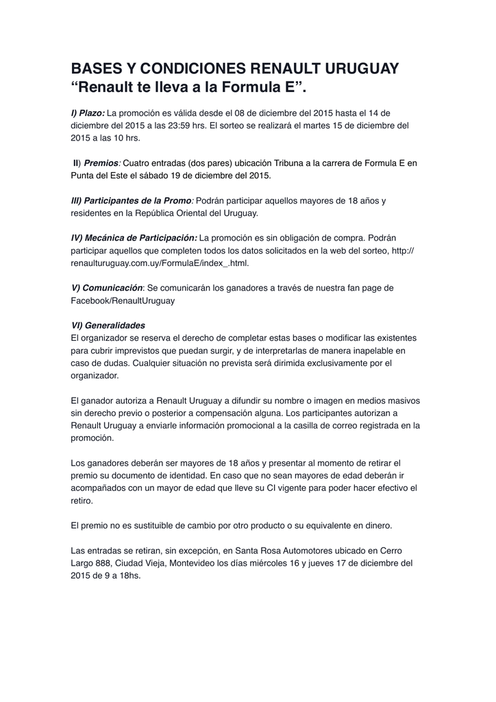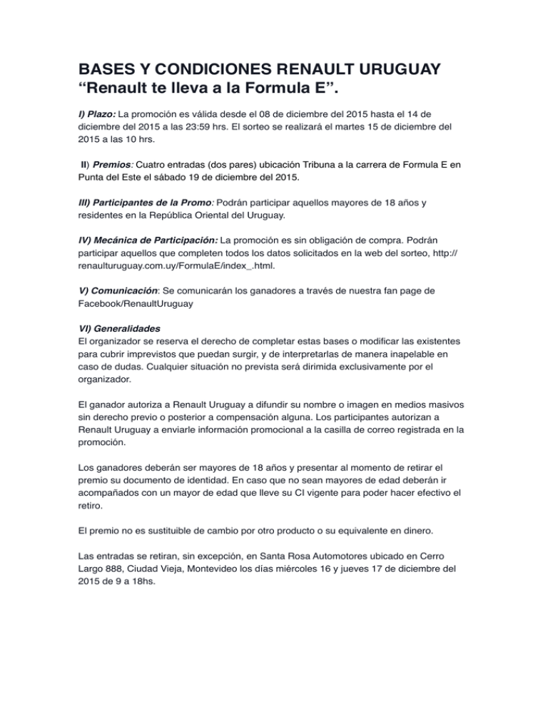 BASES Y CONDICIONES RENAULT URUGUAY “Renault te lleva a la Formula E”. I) Plazo: La promoción es válida desde el 08 de diciembre del 2015 hasta el 14 de diciembre del 2015 a las 23:59 hrs. El sorteo se realizará el martes 15 de diciembre del 2015 a las 10 hrs. II) Premios: Cuatro entradas (dos pares) ubicación Tribuna a la carrera de Formula E en Punta del Este el sábado 19 de diciembre del 2015. III) Participantes de la Promo: Podrán participar aquellos mayores de 18 años y residentes en la República Oriental del Uruguay. IV) Mecánica de Participación: La promoción es sin obligación de compra. Podrán participar aquellos que completen todos los datos solicitados en la web del sorteo, http:// renaulturuguay.com.uy/FormulaE/index_.html. V) Comunicación: Se comunicarán los ganadores a través de nuestra fan page de Facebook/RenaultUruguay VI) Generalidades El organizador se reserva el derecho de completar estas bases o modificar las existentes para cubrir imprevistos que puedan surgir, y de interpretarlas de manera inapelable en caso de dudas. Cualquier situación no prevista será dirimida exclusivamente por el organizador. El ganador autoriza a Renault Uruguay a difundir su nombre o imagen en medios masivos sin derecho previo o posterior a compensación alguna. Los participantes autorizan a Renault Uruguay a enviarle información promocional a la casilla de correo registrada en la promoción. Los ganadores deberán ser mayores de 18 años y presentar al momento de retirar el premio su documento de identidad. En caso que no sean mayores de edad deberán ir acompañados con un mayor de edad que lleve su CI vigente para poder hacer efectivo el retiro. El premio no es sustituible de cambio por otro producto o su equivalente en dinero. Las entradas se retiran, sin excepción, en Santa Rosa Automotores ubicado en Cerro Largo 888, Ciudad Vieja, Montevideo los días miércoles 16 y jueves 17 de diciembre del 2015 de 9 a 18hs.