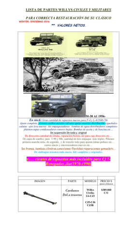 LISTA DE PARTES WILLYS CIVILES Y MILITARES PARA CORRECTA RESTAURACIÓN DE SU CLÁSICO WINTER /INVIERNO 2016 ** VALORES NETOS. M-38 A1 1956En stock: Gran cantidad de repuestos nuevos para F-4 y L-4(1940-70) Ajuste completo, pístones-anillos-metales-válvulas-guías-resortes-distribución-cigueñalesculatas –ejes leva nuevos –kit empaquetaduras –bombas de agua-distribuidores completosplatinos-tapas-condensadores-rotores-bujias, Bombas de aceite y de bencina.etc… De suspensión De todo y original De dirección-cantidad de rótulas, reparación bieleta ,kit para caja dirección etc… De cajas de cambio: para T-90 y Mb, cantidad de kits empaque más triples. Piñones primera-marcha atrás, de segunda , y de transfer todo para ajustar,lainas polines etc… carros sincro y sincronizadores nuevos etc… De frenos, bombas,cilindros,conexiones-flexibles-reparaciones-gomas)etc… De embrague tenemos todo nuevo, kits completos y originales. y….. cientos de repuestos más incluidos para Cj 7Renegados ,ika(1970-1990) IMAGEN PARTE MODELO PRECIO $ (pesos chilenos) Cardanes Del.o traseros Willys Civiles 2A-CJ3 CJ5-CJ6 CJ3B $389.000 C/U WILLYS L4 Y F4 KIT PISTONES AMERICANOS STD A 0,60 KIT $250.000 ANILLOS SET $68.000 FLEXIBLE AIRE FILTRO Willys CJ5 $18.000 MOTORES HURRICANE F-4 Base o cacerola filtro aire (húmedo) Con abrazadera Base Filtros Willys civiles $ 38.000 MANOS CARBURADOR Willys $39.000 Cj2a cj3 CUALQUIERA CJ5,CJ AMBOS MODELOS 3B A FILTRO HURRICANE Y PLANO FILTRO AIRE HÚMEDO SERVICIO PESADO WILLYS $ 345.000 1942-60 CROOSOVER FILTRO A CARBURADOR Mazas traseras nuevas WILLYS MOTOR PLANO (L4) $58.000 WILLYS CJ’2ª-3-5 CJ3B $120.000 SET WILLYS EMPAQUETADURAS AMBOS MOTORES $115.000 VALVULAS L4 Y F4 WILLYS $21.000 C/U PREMIUM L4 Y F4 GUIAS $ 10.000 C/U TAQUIES $ 25.000 C/U ORIGINALES Porta filtro Motor Plano L-4 (go-devil) Con pernos Willys 58.000 CJ’s 85.000 5 Y Pintura powdercoating militares Parachoque Delantero Porta Bidón CJ’s 22.000 Solido Y Reprod. militares Porta antena MB’s 45.000 m-38 militares IMAGEN PARTE MODELO PRECIO (pesos) Parachoque Trasero Series Willys 88.000 Pintura militares C/U powdercoating GORROS de acero TAPA Puntas EJES TAPA importada Radiador Especial para enfriador desértico Willys 12.000 c/u Todos Willys 16.000 Canastillo porta termostato Motor L4 (plano) Termostato Hurricane f-4 Y Plano L-4 Willys 10.500 Willys 18.000 WILLYS SET REFRIGERA CION CJ’s 35.000 WILLYS 8.800 PASA CABLES BUJIAS Hurricane CJ’5 BOLAS PALANCAS CJ’s M-38 set 29.800 MOTOR L 4(plano) REACONDI CIONADO Con :volante rectificado Carburador solex nuevo.b.bencina nueva ,alternador nuevo ,aspa,distribuidor, bujias,cables, filtro aceite nuevo y bomba .aceite Valvula positiva nueva y bomba agua nueva. + video funcionando. + los 2 soportes. Distribuidor nuevo u.s.a. y MB’s $ CJ2,3ª 5.800.000 M-38 1942-52 Con motor De recambio Willys $ todos $188.000 reacondicionado $ 120.000 Tapas Distribuidor Willys …….. $ 28.000 Rotores ……… 15.000 Platinos ……….. 17.500 Condensador ……….. …… Bujías 8.000 6.000 CORRECTAS Todo importado U.S.A. GOMA DOBLE PALANCAS IMPORTADA U.S.A. WILLYS TODOS $24.000 IMAGEN PARTE MODELO MOTOR F4 Hurricane Series Willys CJ5 REACONDICIONADO Con :volante rectificado Carburador solex nuevo.b.bencina nueva ,alternador nuevo ,aspa,distribuidor, bujias,cables, filtro aceite nuevo y bomba .aceite Valvula positiva nueva y bomba agua nueva. + los 2 soportes. Carburador nuevos Para F-4 y L-4 (plano) CJ’s PRECIO (pesos $ 5.500.000 Con motor de recambio $240.000 $88.000 Bomba freno Willys 46-66 Reparaciones Set para de bomba y 4 cil. Y cilindros bomba Oferta $30.000 Todo el set Cilindros de CJ’s $ 56.000 freno m-38 y C/u Delantero y m-38 a1 traseros Tirantes Torpedo a mascara Con tuercas y pernos CJ’s 19.000 c/u m-38 y m-38 a1 Bidón Militar +Protector lona militar impermeable Todos $ 75.000 Obsequio Protector solo = $18.000 Válvula + Recuperadora gases todos 33.000 Motores Willys De partida militares $495.000 y Nuevo y civiles moderno l4 y f4 12 volt. Polea Eje cigüeñal Willys $68.000 Doble y simple Hurricane Y l-4 (plano) tela lona Militar Impermeable u.s.a Lista para confeccionar (cantidad requerida winter top + ptas. Arco capota abatible militar + 6 piezas de anclaje + plantilla perforaciones. Willys 6 mts. $ 250.000 Cj 5 y $ 470.000 cjs2/3ª m-38 y m-38 a1 Arco capota civil completo Cj 5 cj3b y 3a $420.000 CJ’s m-38 y 43.000 para pedalera m-38 a1 (juego resorte pedal) Amortiguador De retroceso Fuelles palancas y (2)arandelas MANIJAS MILITARES NUEVAS Arco hacha Loops Con tornillos y tuercas CJ’s 39.000 m-38 y SET m-38 a1 WILLYS $ 28.000 M-38 Y MB WW2 m-38. mb MB’s CJ’s m-38 y m-38 a1 Bisagra hacha Willys Mb – m38 Cada unidad $25.000 $5.000 c/u $35.000 SET 3 Elementos Con pernos especiales Arco pala militar Willys $ 68.000 MILITARES M-38 y MB Funda acero Willys Para hacha militares 23.000 $32.000 Plancha soporte Largo trasero Caja principal CJ’s 22.000 m-38 y Pintura powdercoating m-38 a1 Planchón protección Caja de cambios CJ’s 89.000 m-38 y m-38 a1 Pintura powdercoating WILLYS Soportes motor (2) importados TODOS Almohadillas Militares para Cinturón de seguridad CJ’s m-38 y m-38 a1 etc.. Kit Enfriador Desierto Nacional (viene completo) $38.000 PAR 10.000 par MB’s $74.000 CJ’s m-38 y m-38 a1 etc.. Kit enfriador Desértico Willys todos $385.000 IMPORTADO IMAGEN PARTE MODELO PRECIO (pesos) BlACK OUT Series 12V Willys $150.000 O lector militares mapa Velocímetro Willys $92.000 Velocímetro Cj 5 .3B etc.. Willys $198.000 Porta Repuesto civil LATERAL CON PERNOS Pintura powdercoating CJ’s $ 57.000 Placa de Datos Set Placas de Datos para MB civiles CJ’s civil 35.000 MB’s $ 60.000 TAPA WILLYS GUANTERA $ 69.300 MB MB TAPA GUANTERA NUEVA WILLYS TAPA GUANTERA PARA REPARAR WILLYS CJ5 $ 19.000 Espejo y brazo Willys Civil o mil. $ 78.000 Placas de Datos + plancha M38 Espejo redondo militar u.s.a. Series Militares $38.000 F