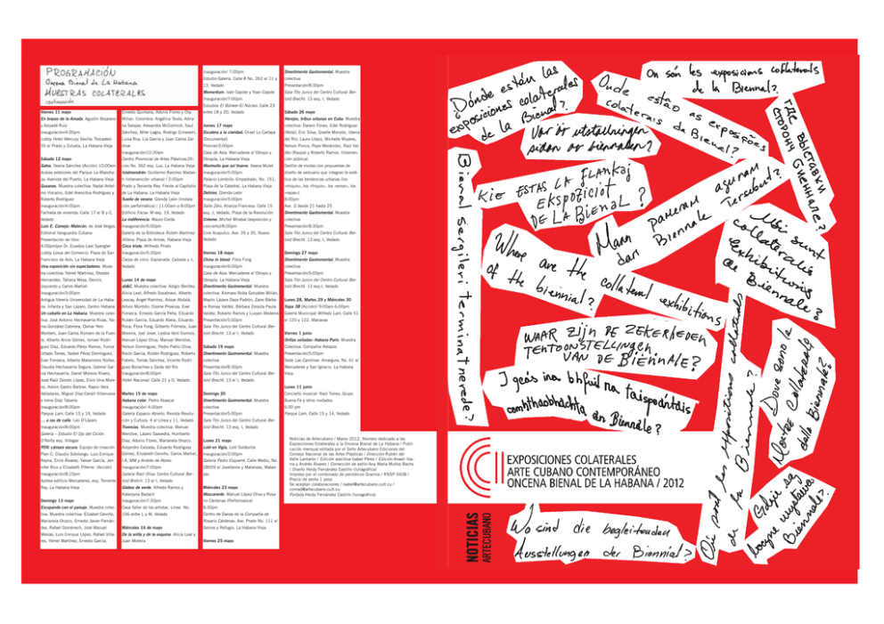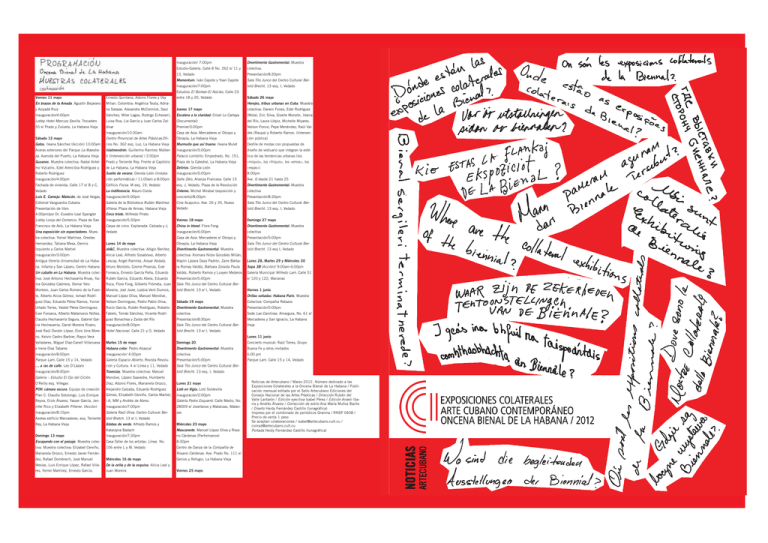 Inauguración/ 7:00pm Divertimento Gastromental. Muestra Estudio-Galería. Calle 8 No. 262 e/ 11 y colectiva. 13, Vedado Presentación/8:30pm Momentum. Iván Capote y Yoan Capote Sala Tito Junco del Centro Cultural Ber- Inauguración/7:00pm told Brecht. 13 esq. I, Vedado Estudios El Búnker-El Núcleo. Calle 23 entre 18 y 20, Vedado Sábado 26 mayo Viernes 11 mayo Ernesto Quintana, Adonis Flores y Osy En brazos de la Amada. Agustín Bejarano Milian. Colombia: Angélica Teuta, Adria- y Aziyadé Ruiz na Salazar, Alexandra McCormick, Saul Jueves 17 mayo colectiva: Darwin Fones, Edel Rodríguez Inauguración/4:00pm Sánchez, Miler Lagos, Rodrigo Echeverri, Escalera a la claridad. Crisel Lo Cartaya (Mola), Eric Silva, Giselle Monzón, Idania Lobby Hotel Mercury Sevilla. Trocadero Luisa Roa, Lia García y Juan Carlos Zal- (Documental) del Río, Laura Llópiz, Michelle Miyares, 55 e/ Prado y Zulueta, La Habana Vieja dívar Premier/3:00pm Nelson Ponce, Pepe Menéndez, Raúl Val- Inauguración/10:30am Casa de Asia. Mercaderes e/ Obispo y dés (Raupa) y Roberto Ramos. (Interven- Sábado 12 mayo Centro Provincial de Artes Plásticas.Ofi- Obrapía, La Habana Vieja ción pública) Gatos. Ileana Sánchez (Acción) 10:00am cios No. 362 esq. Luz, La Habana Vieja Murmullo que así trueno. Ileana Mulet Desfile de modas con propuestas de Aceras exteriores del Parque La Maestra- Islalmendrón. Guillermo Ramírez Malber- Inauguración/5:00pm diseño de vestuario que integran la esté- za. Avenida del Puerto, La Habana Vieja ti (Intervención urbana) / 2:00pm Palacio Lombillo. Empedrado, No. 151, tica de las tendencias urbanas (los Gusanos. Muestra colectiva: Nadal Antel- Prado y Teniente Rey. Frente al Capitolio Plaza de la Catedral, La Habana Vieja «miquis», los «friquis», los «emos», los mo Vizcaíno, Edel Arencibia Rodríguez y de La Habana, La Habana Vieja Delirios. Glenda León «repas») Roberto Rodríguez Sueño de verano. Glenda León (Instala- Inauguración/5:00pm 8:00pm Inauguración/4:00pm ción performática) / 11:00am a 8:00pm Salle Zéro, Alianza Francesa. Calle 15 Ave. G desde 21 hasta 25 Fachada de vivienda. Calle 17 e/ B y C, Edificio Focsa. M esq. 19, Vedado esq. J, Vedado, Plaza de la Revolución Divertimento Gastromental. Muestra colectiva Herejes, tribus urbanas en Cuba. Muestra Vedado La indiferencia. Mauro Corda Créeme. Michel Mirabal (exposición y Luis E. Camejo: Malecón, de José Veigas, Inauguración/5:00pm concierto)/8:00pm Presentación/8:30pm Editorial Vanguardia Cubana Galería de la Biblioteca Rubén Martínez Cine Acapulco. Ave. 26 y 35, Nuevo Sala Tito Junco del Centro Cultural Ber- Presentación de libro Villena. Plaza de Armas, Habana Vieja Vedado told Brecht. 13 esq. I, Vedado 4:00pm/por Dr. Eusebio Leal Spengler Circo triste. Wilfredo Prieto Lobby Lonja del Comercio. Plaza de San Inauguración/5:30pm Viernes 18 mayo Domingo 27 mayo Francisco de Asís, La Habana Vieja Carpa de circo. Explanada: Calzada y J, China in blood. Flora Fong Divertimento Gastromental. Muestra Una exposición sin espectadores. Mues- Vedado Inauguración/6:00pm colectiva tra colectiva: Yornel Martinez, Orestes Casa de Asia. Mercaderes e/ Obispo y Presentación/5:00pm Obrapía, La Habana Vieja Sala Tito Junco del Centro Cultural Bertold Brecht. 13 esq I, Vedado Hernandez, Tatiana Mesa, Dennis Lunes 14 de mayo Izquierdo y Carlos Martiel ab&C. Muestra colectiva: Adigio Benítez, Divertimento Gastromental. Muestra Inauguración/3:00pm Alicia Leal, Alfredo Sosabravo, Alberto colectiva: Xiomara Nidia Gonzáles Milián, Antigua librería Universidad de La Haba- Lescay, Angel Ramírez, Aissar Abdalá, Maylin Lázara Daza Padrón, Zaire Bárba- Lunes 28, Martes 29 y Miércoles 30 na. Infanta y San Lázaro, Centro Habana Arturo Montoto, Cosme Proenza, Ever ra Romay Valdéz, Bárbara Zoraida Paula Sopa 3B (Acción)/ 9:00am-6:00pm Un caballo en La Habana. Muestra colec- Fonseca, Ernesto García Peña, Eduardo Valdéz, Roberto Ramos y Luvyen Mederos Galería Municipal Wifredo Lam. Calle 51 tiva: José Antonio Hechavarría Rivas, Yai- Rubén García, Eduardo Abela, Eduardo Presentación/5:00pm e/ 120 y 122, Marianao ma González Cabrrera, Osmar Yero Roca, Flora Fong, Gilberto Frómeta, Juan Sala Tito Junco del Centro Cultural Ber- Montero, Juan Carlos Romero de la Fuen- Moreira, Joel Jover, Lesbia Vent Dumois, told Brecht. 13 e/ I, Vedado te, Alberto Arcos Gómez, Ismael Rodrí- Manuel López Oliva, Manuel Mendive, guez Díaz, Eduardo Pérez Ramos, Yunior Nelson Domínguez, Pedro Pablo Oliva, Sábado 19 mayo Colectiva: Compañia Retazos Urtado Torres, Yasbel Pérez Domínguez, Rocío García, Rubén Rodríguez, Roberto Divertimento Gastromental. Muestra Presentación/5:00pm Ever Fonseca, Alberto Matamoros Núñez, Fabelo, Tomás Sánchez, Vicente Rodrí- colectiva Sede Las Carolinas. Amargura, No. 61 e/ Claudia Hechavarría Segura, Gabriel Gar- guez Bonachea y Zaida del Río Presentación/8:30pm Mercaderes y San Ignacio, La Habana cía Hechavarría, Dariel Moreira Rivero, Inauguración/8:00pm Sala Tito Junco del Centro Cultural Ber- Vieja José Raúl Dorzón López, Elvis Urra More- Hotel Nacional. Calle 21 y O, Vedado told Brecht. 13 e/ I, Vedado Valladares, Miguel Díaz-Canell Villanueva Martes 15 de mayo Domingo 20 Concierto musical: Raúl Torres, Grupo e Irene Díaz Tabares Habana color. Pedro Abascal Divertimento Gastromental. Muestra Buena Fe y otros invitados Inauguración/8:00pm Inauguración/ 4:00pm colectiva 6:00 pm Parque Lam, Calle 15 y 14, Vedado Galería Espacio Abierto. Revista Revolu- Presentación/5:00pm Parque Lam. Calle 15 y 14, Vedado Viernes 1 junio Orillas soñadas: Habana París. Muestra no, Kelvin Castro Barbier, Rayco Vera Lunes 11 junio … a ras de calle. Leo D’Lázaro ción y Cultura. 4 e/ Línea y 11, Vedado Sala Tito Junco del Centro Cultural Ber- Inauguración/8:00pm Travesías. Muestra colectiva: Manuel told Brecht. 13 esq. I, Vedado Galería – Estudio El Ojo del Cicl
