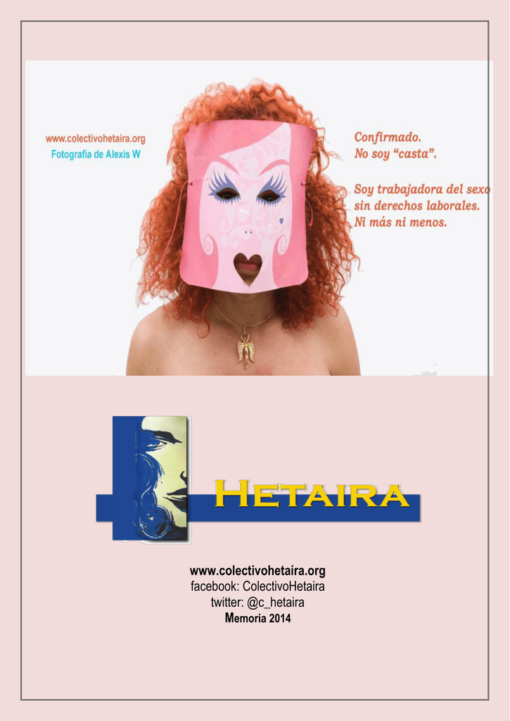 www.colectivohetaira.org facebook: ColectivoHetaira twitter: @c_hetaira Memoria 2014 Memoria 2014 Estimada socia/ estimado socio, amigas y amigos: Os presentamos la Memoria del año 2014, un año perfilando propuestas y elaborando informes, un año trabajando el empoderamiento de las trabajadoras del sexo, acudiendo a actos públicos en diversidad de foros. Ni más ni menos que otros años probablemente, pero se han dado circunstancias y contextos que han hecho de este año diferente. Por ejemplo, las trabajadoras del sexo volvieron a manifestarse en la calle, vivimos la visita de nuestras colegas europeas en el marco del Proyecto Indoors, disfrutamos de la fuerza renovada con la que se ha mostrado el movimiento feminista en la calle contra la Ley Gallardón, participamos en la quincena de lucha feminista “A por todas”, en el marco del 8 de marzo, donde las trabajadoras del sexo fueron muy bien recibidas… Ha habido hitos en este año 2014 que nos han aportado fuerzas para continuar y razones para pensar que, tal vez, no lo estamos haciendo tan mal. Un año en el que, como Asociación, nos seguimos defendiendo de acusaciones perversas, injurias que buscan deslegitimar nuestro trabajo y contra las que intentamos poner remedio. Le pese a quien le pese, seguimos sin ser financiadas por proxenetas ni empresarios de la industria del sexo. De hecho, quienes mantienen este barco a flote, sois socias y socios como tú, personas individuales, que aportan una media de 20 euros mensuales, junto a subvenciones cada vez más exiguas, pero que seguimos recibiendo, aunque a veces nuestro trabajo pueda resultar incómodo. Por suerte, por coherencia, continuamos defendiendo los intereses y los derechos de las trabajadoras del sexo. Ni más, ni menos ;-) Muchísimas gracias por vuestro apoyo y compañía, seguimos creciendo con vosotrxs. Un fuerte abrazo PRESENTACIÓN Hetaira es el nombre que se les daba en la antigua Grecia a mujeres libres, independientes, que ejercían la prostitución y que disponían de una esmerada educación y, algunas, gran influencia y prestigio social. El Colectivo Hetaira nació el 12 de marzo de 1995 a iniciativa de un grupo muy heterogéneo de mujeres. Nuestra característica principal es que se trataba de un colectivo mixto, es decir, algunas ejercían la prostitución y otras, otro tipo de trabajos, pero todas tenían como objetivo crear una asociación que se convirtiera en un lugar de encuentro y solidaridad entre mujeres. En aquellos momentos el objetivo principal era la ne cesidad de organizarse para combatir el estigma social que recae sobre las prostitutas; para defender sus derechos: -a trabajar tranquilas, -a organizarse, -a sindicarse, -a cotizar a la Seguridad Social; -para denunciar las agresiones físicas, los chantajes; los abusos de poder y - para favorecer su organización en defensa de sus intereses como trabajadoras. A día de hoy, nuestros fines siguen siendo muy similares pero los hemos ampliado porque las circunstancias así nos lo han exigido y por cómo se ha ido complejizando la realidad en la que trabajamos: 1. La defensa y promoción de la autonomía de las mujeres, la igualdad de oportunidades entre mujeres y hombres, así como la lucha contra la violencia de género y las desigualdades por cuestiones de género. 2. La defensa y la difusión de los derechos humanos y los valores democráticos de justicia, libertad, igualdad, solidaridad, laicidad, cooperación, resolución no violenta de conflictos, tolerancia y pluralismo. 3. La solidaridad, el apoyo y la defensa de los derechos de las personas inmigrantes, promoviendo su integración social, su igualdad en derechos y oportunidades y su acceso a la ciudadanía; la lucha contra todas las formas de discriminación racial y xenófoba; y la defensa de los valores de tolerancia y pluralismo cultural desde una perspectiva intercultural. 4. Aumentar y difundir sus conocimientos, respecto a la problemática relacionada con la prostitución. 5. Crear un lugar de encuentro para debate externo e interno en torno a la problemática de la prostitución. 6. Luchar contra el estigma y la marginación que sufren las personas que ejercen la prostitución. 7. Luchar por la consecución de los derechos de las trabajadoras sexuales. 8. Detectar y apoyar a las víctimas de trata de seres humanos. La protección, atención, asistencia formativa, informativa, jurídica y psicológica de las mujeres víctimas de trata obligadas a ejercer la prostitución. 9. El apoyo a las mujeres para la mejora de su situación laboral, incidiendo en su formación (educacional y profesional), dándole valor al uso de las nuevas Tecnologías de la Información y la Comunicación (TIC). 10. La promoción de la salud, la educación socio-sanitaria, la prevención del VIH/Sida y de las Infecciones de Transmisión Sexual (ITS). Memoria 2014 Una aproximación a nuestro funcionamiento Hetaira está formada por activistas, de las cuales dos son personas asalariadas por la asociación. Nos reunimos en asamblea una vez al mes y nos distribuimos en distintos grupos especializados para hacer más efectivo nuestro trabajo: 1. Comisión Ejecutiva se encarga de trabajar los campos técnicos de la actividad de la asociación así como los asuntos que requieren resolución entre la temporalidad de las asambleas. 2. Intervención social/trabajo de campo es el grupo más numeroso de la asociación y la base desde donde se nutre nuestro discurso. Se divide, a su vez, en 5 equipos teniendo en cuenta los diferentes espacios donde trabajamos con las mujeres: espacios públicos, locales, internet y el centro de atención. 3. La Comisión de Estudio incuba ideas, las desarrolla, se encarga de estudiar nuevas situaciones sobre las que hemos tenido conocimiento, desgrana la legislación, compara los contextos sobre prostitución en diferentes países, analiza factores relacionales, etc… 4. A Hetaira llegan una gran diversidad de propuestas relacionadas con