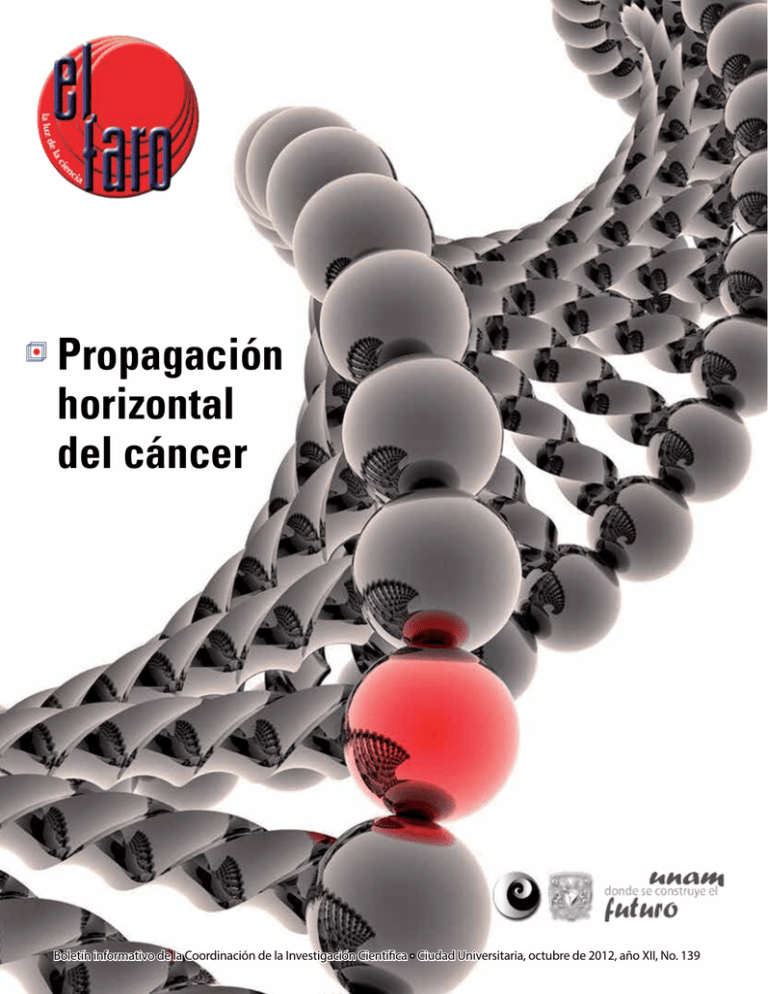 Propagación horizontal del cáncer Boletín informativo de la Coordinación de la Investigación Científica Ciudad Universitaria, octubre de 2012, año XII, No. 139 Sumario 3 Editorial 4 Espacio abierto Modelo para estimar compuestos orgánicos en el aire Yassir Zárate Méndez 6 8 10 Asómate a la ciencia Navegadores quirúrgicos José Antonio Alonso García 12 Perfiles Más allá del aula y el laboratorio Lena Ruiz Azuara Alicia Ortiz Rivera 13 Reseñas El desafío del cangrejo Sandra Vázquez Quiroz A ver si puedes Alejandro Illanes Instituto de Matemáticas El faro avisa 2 el faro · octubre de 2012 · No. 139 14 Reportaje Cáncer de mama, un mal curable Yassir Zárate Méndez Hallazgos Propagación horizontal del cáncer Patricia de la Peña Sobarzo y Sandra Vázquez Quiroz Historia de la ciencia La telomerasa: enzima de la inmortalidad Patricia de la Peña Sobarzo Dr. José Narro Robles Rector Dr. Eduardo Bárzana García Secretario General Lic. Enrique del Val Blanco Secretario Administrativo Dr. Carlos Arámburo de la Hoz Coordinador de la Investigación Científica El faro, la luz de la ciencia Patricia de la Peña Sobarzo Directora Yassir Zárate Méndez Supervisor editorial Sandra Vázquez Quiroz, Óscar Peralta, Víctor Manuel Hernández Correa, José Antonio Alonso García y Alicia Ortiz Rivera Colaboradores Paola Andrea Moreno Franco y Víctor Manuel Hernández Correa Diseño gráfico y formación El faro, la luz de la ciencia, es una publicación mensual (con excepción de los meses de julio-agosto y diciembreenero) de la Coordinación de la Investigación Científica. Oficina: Coordinación de la Investigación Científica, Circuito de la Investigación, Ciudad Universitaria, 04510 México, D.F., teléfono 5550 8834. Certificado de reserva de derechos al uso exclusivo del título, en trámite. Impresión: Reproducciones Fotomecánicas, S.A. de C.V., Democracias 116, Col. San Miguel Amantla, Azcapotzalco, C.P. 02700, México, D.F. Tiraje: 5,200 ejemplares. Distribución: Coordinación de la Investigación Científica.1er piso, Ciudad Universitaria. Prohibida la reproducción parcial o total del contenido, por cualquier medio impreso o electrónico sin la previa autorización. Correo [email protected] Siguenos en: Boletin El faro UNAM @ElfaroUNAM Nuestra portada Un hecho decisivo y trascendental para el avance de la ciencia ocurrió en 1952, cuando se confirmó el papel exclusivo del ADN en la transmisión de información genética. Ilustración artística tomada de http://wallpapersstore.net/wallpaper/ dna-strand-wallpaper/ Los números del cáncer de mama Editorial Directorio UNAM El cáncer de mama es un tema preocupante en los países de ingresos bajos y medios –como México– que, comparados con países económicamente más fuertes, muestran una disparidad en la tasa de sobrevivencia entre distintos segmentos sociales. En 2008, a nivel mundial, de 1.3 millones de casos reportados, 460,000 fueron causa de muerte, y de estos, 290,000 fueron en grupos sociales de bajos ingresos. La tendencia global muestra que la incidencia y la mortalidad han aumentado. El incremento en México de casos de muerte por cáncer ha pasado de 58 por cada 100,000 habitantes en 1998, a 65 en 2009. Al estar ligado el índice de mortalidad con la pobreza, el cáncer de mama se convierte en un problema para el país. De acuerdo con el Sistema Único de Información para la Vigilancia Epidemiológica, las mayores incidencias de la enfermedad ocurren en Coahuila y el Distrito Federal, mientras que las más bajas en Quintana Roo y Chiapas. Y el riesgo de enfermar es mayor en las ciudades que en las zonas rurales. La Secretaría de Salud publicó normas oficiales para la prevención de este mal, en las que sugiere exámenes periódicos y estudios mamográficos; sin embargo, según algunas evaluaciones, la incidencia sigue al alza. El equipo mamográfico es escaso en México, así como el personal calificado para realizar los estudios. De acuerdo con la Organización Mundial de la Salud (OMS), en 2010 había 314 equipos en centros públicos y 366 en establecimientos privados. La cobertura nacional fue de 19.2%, pero la OMS recomienda que para que sea efectiva una medida sanitaria debe cubrir al menos a 70% de la población. Una de las razones del aumento en la incidencia de mortalidad en cáncer de mama en México es que se detecta en etapas avanzadas. De hecho, estadísticas clínicas de hospitales públicos del Distrito Federal de 2007 indican que 90% de los diagnósticos de cáncer fueron a través de la autoexploración, lo cual contrasta con otros países, como Estados Unidos, donde 60% de los casos detectados se logró a través de mamografías. Esto se suma a la escasa o nula información, las deficiencias en la educación, los prejuicios que aún prevalecen y el desabasto de medicamentos. En el flanco de la esperanza se destaca que países como Brasil, Argentina y Chile han aplicado campañas de prevención más efectivas que las implementadas en México, que podrían servir como ejemplo para replicarlas aquí, sin necesidad de importar modelos más costosos de Europa o Norteamérica. El faro el faro · octubre de 2012 · No. 139 3 Espacio abierto 4 Modelo para estimar compuestos orgánicos en el aire Yassir Zárate Méndez Millones de automóviles circulan diariamente por calles, avenidas y carreteras. Diferentes estudios apuntan a las emisiones que producen los vehículos como algunas de las principales responsables de los cambios en la composición del aire. El aire que se respira en las ciudades es un asunto que preocupa y ocupa a equipos multidisciplinarios de científicos. Un ejemplo lo representa el grupo de Mutagénesis Ambiental, del Centro de Ciencias de la Atmósfera (CCA), del que forma parte el doctor Omar Amador Muñoz. Cada segundo se expelen a la atmósfera millones de partículas orgánicas e inorgánicas, siendo los vehículos automotores los responsables de buena parte d