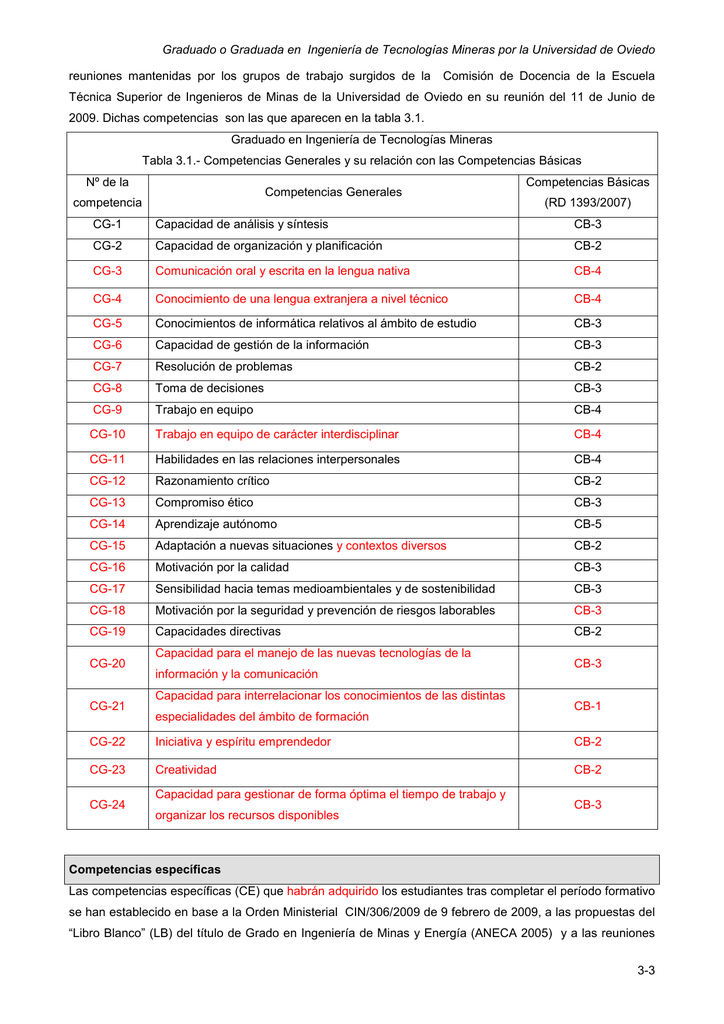Graduado o Graduada en Ingeniería de Tecnologías Mineras por la Universidad de Oviedo reuniones mantenidas por los grupos de trabajo surgidos de la Comisión de Docencia de la Escuela Técnica Superior de Ingenieros de Minas de la Universidad de Oviedo en su reunión del 11 de Junio de 2009. Dichas competencias son las que aparecen en la tabla 3.1. Graduado en Ingeniería de Tecnologías Mineras Tabla 3.1.- Competencias Generales y su relación con las Competencias Básicas Nº de la Competencias Generales competencia Competencias Básicas (RD 1393/2007) CG-1 Capacidad de análisis y síntesis CB-3 CG-2 Capacidad de organización y planificación CB-2 CG-3 Comunicación oral y escrita en la lengua nativa CB-4 CG-4 Conocimiento de una lengua extranjera a nivel técnico CB-4 CG-5 Conocimientos de informática relativos al ámbito de estudio CB-3 CG-6 Capacidad de gestión de la información CB-3 CG-7 Resolución de problemas CB-2 CG-8 Toma de decisiones CB-3 CG-9 Trabajo en equipo CB-4 CG-10 Trabajo en equipo de carácter interdisciplinar CB-4 CG-11 Habilidades en las relaciones interpersonales CB-4 CG-12 Razonamiento crítico CB-2 CG-13 Compromiso ético CB-3 CG-14 Aprendizaje autónomo CB-5 CG-15 Adaptación a nuevas situaciones y contextos diversos CB-2 CG-16 Motivación por la calidad CB-3 CG-17 Sensibilidad hacia temas medioambientales y de sostenibilidad CB-3 CG-18 Motivación por la seguridad y prevención de riesgos laborables CB-3 CG-19 Capacidades directivas CB-2 CG-20 CG-21 Capacidad para el manejo de las nuevas tecnologías de la información y la comunicación Capacidad para interrelacionar los conocimientos de las distintas especialidades del ámbito de formación CB-3 CB-1 CG-22 Iniciativa y espíritu emprendedor CB-2 CG-23 Creatividad CB-2 CG-24 Capacidad para gestionar de forma óptima el tiempo de trabajo y organizar los recursos disponibles CB-3 Competencias específicas Las competencias específicas (CE) que habrán adquirido los estudiantes tras completar el período formativo se han establecido en base a la Orden Ministerial CIN/306/2009 de 9 febrero de 2009, a las propuestas del “Libro Blanco” (LB) del título de Grado en Ingeniería de Minas y Energía (ANECA 2005) y a las reuniones 3-3 Objetivos mantenidas por los grupos de trabajo surgidos de la Comisión de Docencia de la Escuela Técnica Superior de Ingenieros de Minas de la Universidad de Oviedo en su reunión del 11 de Junio de 2009. Suman un total de 59 competencias específicas, que se recogen en las tablas 3.2. y 3.3. La tabla 3.2. comprende competencias procedentes de la Orden CIN/306/2009. En primer lugar Incluye las competencias de Formación Básica más las competencias Comunes a la Rama de Minas (21 competencias en total), las cuales son obligatorias para cualquier título de Grado de la rama de Minas según la Orden Ministerial. A continuación recoge una selección de 16 competencias de las diversas Tecnologías Específicas (Explotación de Minas, Mineralurgia y Metalurgia, Recursos Energéticos, Combustibles y Explosivos, y Sondeos y Prospecciones Mineras), escogidas expresamente de entre las 36 (eliminadas duplicidades) que contempla la citada Orden, con el fin de dotar al Grado de un carácter lo más generalista posible. Finalmente incluye la competencia correspondiente al Trabajo Fin de Grado, también exigida por la Orden. Por su parte, en la tabla 3.3 se recogen otras 21 competencias específicas que han sido añadidas con carácter libre por la Universidad de Oviedo, seleccionadas de entre los diversos campos de actividad profesional del titulado de la rama de minas, al objeto de ampliar aun más el espectro de formación de la titulación e incidir en su carácter de Grado generalista. Las competencias específicas que adquirirán los/las egresados/das del Grado en Ingeniería de Tecnologías Mineras garantizan que se cubren las competencias específicas necesarias para tener acceso al Master en Ingeniería de Minas. GRADUADO/A EN INGENIERIA DE TECNOLOGIAS MINERAS POR LA UNIVERSIDAD DE OVIEDO Tabla 3.2.- Competencias específicas Orden Ministerial Formación Básica Capacidad para la resolución de los problemas matemáticos que puedan plantearse en la ingeniería. CE1 Aptitud para aplicar los conocimientos sobre: álgebra lineal; geometría; geometría diferencial; cálculo diferencial e integral; ecuaciones diferenciales y en derivadas parciales; métodos numéricos; algorítmica numérica; estadística y optimización Capacidad de visión espacial y conocimiento de las técnicas de representación gráfica, tanto por CE2 métodos tradicionales de geometría métrica y geometría descriptiva, como mediante las aplicaciones de diseño asistido por ordenador. CE3 Conocimientos básicos sobre el uso y programación de los ordenadores, sistemas operativos, bases de datos y programas informáticos con aplicación en ingeniería Comprensión y dominio de los conceptos básicos sobre las leyes generales de la mecánica, CE4 termodinámica, campos y ondas y electromagnetismo y su aplicación para la resolución de problemas propios de la ingeniería. CE5 CE6 3-4 Conocimientos básicos de geología y morfología del terreno y su aplicación en problemas relacionados con la ingeniería. Climatología Conocimiento adecuado del concepto de empresa, marco institucional y jurídico de la empresa. Graduado o Graduada en Ingeniería de Tecnologías Mineras por la Universidad de Oviedo Organización y Gestión de empresas Común a la Rama de Minas CE7 CE8 CE9 Capacidad para la resolución de ecuaciones diferenciales ordinarias para su aplicación en los problemas de Ingeniería Comprensión de los conceptos de aleatoriedad de los fenómenos físicos, sociales y económicos, así como de incertidumbre. Conocimientos de cálculo numérico básico y aplicado a la ingeniería Comprensión y dominio de los conceptos básicos sobre las leyes generales de la mecánica y de la CE10 termodinámica y su apli