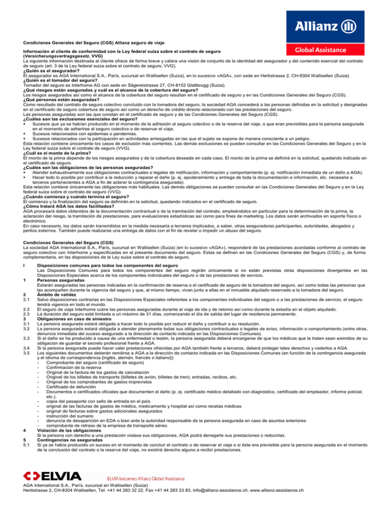 Condiciones Generales del Seguro (CGS) Allianz seguro de viaje Información al cliente de conformidad con la Ley federal suiza sobre el contrato de seguro (Versicherungsvertragsgesetz, VVG) La siguiente información destinada al cliente ofrece de forma breve y calara una visión de conjunto de la identidad del asegurador y del contenido esencial del contrato de seguro (art. 3 de la Ley federal suiza sobre el contrato de seguro, VVG). ¿Quién es el asegurador? El asegurador es AGA International S.A., París, sucursal en Wallisellen (Suiza), en lo sucesivo «AGA», con sede en Hertistrasse 2, CH-8304 Wallisellen (Suiza). ¿Quién es el tomador del seguro? Tomador del seguro es Interhome AG con sede en Sägereistrasse 27, CH-8152 Glattbrugg (Suiza). ¿Qué riesgos están asegurados y cuál es el alcance de la cobertura del seguro? Los riesgos asegurados así como el alcance de la cobertura del seguro resultan en el certificado de seguro y en las Condiciones Generales del Seguro (CGS). ¿Qué personas están aseguradas? Como resultado del contrato de seguro colectivo concluido con la tomadora del seguro, la sociedad AGA concederá a las personas definidas en la solicitud y designadas en el certificado de seguro cobertura de seguro así como un derecho de crédito directo relacionado con las prestaciones del seguro. Las personas aseguradas son las que constan en el certificado de seguro y de las Condiciones Generales del Seguro (CGS). ¿Cuáles son las exclusiones esenciales del seguro? Sucesos que ya se habían producido en el momento de la adhesión al seguro colectivo o de la reserva del viaje, o que eran previsibles para la persona asegurada en el momento de adherirse al seguro colectivo o de reservar el viaje. Sucesos relacionados con epidemias o pandemias. Sucesos relacionados con la participación en actividades arriesgadas en las que el sujeto se expone de manera consciente a un peligro. Esta relación contiene únicamente los casos de exclusión más corrientes. Las demás exclusiones se pueden consultar en las Condiciones Generales del Seguro y en la Ley federal suiza sobre el contrato de seguro (VVG). ¿Cuál es el monto de la prima? El monto de la prima depende de los riesgos asegurados y de la cobertura deseada en cada caso. El monto de la prima se definirá en la solicitud, quedando indicado en el certificado de seguro. ¿Cuáles son las obligaciones de las personas aseguradas? Atender exhaustivamente sus obligaciones contractuales o legales de notificación, información y comportamiento (p. ej. notificación inmediata de un daño a AGA). Hacer todo lo posible por contribuir a la reducción y reparar el daño (p. ej. apoderamiento y entrega de toda la documentación e información, etc. necesaria a terceros pertenecientes a AGA a fin de aclarar la contingencia asegurada). Esta relación contiene únicamente las obligaciones más habituales. Las demás obligaciones se pueden consultar en las Condiciones Generales del Seguro y en la Ley federal suiza sobre el contrato de seguro (VVG). ¿Cuándo comienza y cuándo termina el seguro? El comienzo y la finalización del seguro se definirán en la solicitud, quedando indicados en el certificado de seguro. ¿Cómo tratará AGA los datos facilitados? AGA procesará datos obtenidos de la documentación contractual o de la tramitación del contrato, empleándolos en particular para la determinación de la prima, la aclaración del riesgo, la tramitación de prestaciones, para evaluaciones estadísticas así como para fines de marketing. Los datos serán archivados en soporte físico o electrónico. En caso necesario, los datos serán transmitidos en la medida necesaria a terceros implicados, a saber, otras aseguradoras participantes, autoridades, abogados y peritos externos. También puede realizarse una entrega de datos con el fin de revelar o impedir un abuso del seguro. Condiciones Generales del Seguro (CGS) La sociedad AGA International S.A., París, sucursal en Wallisellen (Suiza) (en lo sucesivo «AGA»), responderá de las prestaciones acordadas conforme al contrato de seguro colectivo con Interhome y especificadas en el presente documento del seguro. Estas se definen en las Condiciones Generales del Seguro (CGS) y, de forma complementaria, en las disposiciones de la Ley suiza sobre el contrato de seguro. I 1 2 2.1 2.2 2.3 3 3.1 3.2 3.3 3.4 3.5 4 5 5.1 Disposiciones comunes para todos los componentes del seguro Las Disposiciones Comunes para todos los componentes del seguro regirán únicamente si no están previstas otras disposiciones divergentes en las Disposiciones Especiales acerca de los componentes individuales del seguro o de las prestaciones de servicio. Personas aseguradas Estarán aseguradas las personas indicadas en la confirmación de reserva o el certificado de seguro de la tomadora del seguro, así como todas las personas que las acompañen durante la vigencia del seguro y que, al mismo tiempo, vivan junto a ellas en el inmueble alquilado reservado a la tomadora del seguro. Ámbito de validez Salvo disposiciones contrarias en las Disposiciones Especiales referentes a los componentes individuales del seguro o a las prestaciones de servicio, el seguro tendrá vigencia en todo el mundo. El seguro de viaje Interhome cubre las personas aseguradas durante el viaje de ida y de retorno así como durante la estadía en el objeto alquilado. La duración del seguro está limitada a un máximo de 31 días, comenzando el día de salida del lugar de residencia permanente. Obligaciones en caso de siniestro La persona asegurada estará obligada a hacer todo lo posible por reducir el daño y contribuir a su resolución. La persona asegurada estará obligada a atender plenamente todas sus obligaciones contractuales o legales de aviso, información o comportamiento (entre otras, denuncia inmediata del suceso asegurado a la dirección de contacto indicada en las Disposiciones Comunes). Si el daño se ha producido a causa de una enferme