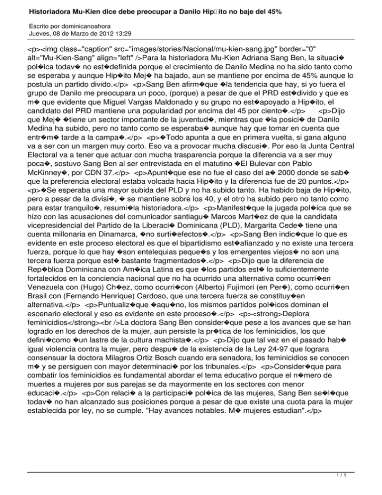 Historiadora Mu-Kien dice debe preocupar a Danilo Hip�ito no baje del 45% Escrito por dominicanoahora Jueves, 08 de Marzo de 2012 13:29 <p><img class="caption" src="images/stories/Nacional/mu-kien-sang.jpg" border="0" alt="Mu-Kien-Sang" align="left" />Para la historiadora Mu-Kien Adriana Sang Ben, la situaci� pol�ica todav� no est�definida porque el crecimiento de Danilo Medina no ha sido tanto como se esperaba y aunque Hip�ito Mej� ha bajado, aun se mantiene por encima de 45% aunque lo postula un partido divido.</p> <p>Sang Ben afirm�que �la tendencia que hay, si yo fuera el grupo de Danilo me preocupara un poco, (porque) a pesar de que el PRD est�divido y que es m� que evidente que Miguel Vargas Maldonado y su grupo no est�apoyado a Hip�ito, el candidato del PRD mantiene una popularidad por encima del 45 por ciento�.</p> <p>Dijo que Mej� �tiene un sector importante de la juventud�, mientras que �la posici� de Danilo Medina ha subido, pero no tanto como se esperaba� aunque hay que tomar en cuenta que entr�m� tarde a la campa�.</p> <p>�Todo apunta a que en primera vuelta, si gana alguno va a ser con un margen muy corto. Eso va a provocar mucha discusi�. Por eso la Junta Central Electoral va a tener que actuar con mucha trasparencia porque la diferencia va a ser muy poca�, sostuvo Sang Ben al ser entrevistada en el matutino �El Bulevar con Pablo McKinney�, por CDN 37.</p> <p>Apunt�que ese no fue el caso del a� 2000 donde se sab� que la preferencia electoral estaba volcada hacia Hip�ito y la diferencia fue de 20 puntos.</p> <p>�Se esperaba una mayor subida del PLD y no ha subido tanto. Ha habido baja de Hip�ito, pero a pesar de la divisi�, � se mantiene sobre los 40, y el otro ha subido pero no tanto como para estar tranquilo�, resumi�la historiadora.</p> <p>Manifest�que la jugada pol�ica que se hizo con las acusaciones del comunicador santiagu� Marcos Mart�ez de que la candidata vicepresidencial del Partido de la Liberaci� Dominicana (PLD), Margarita Cede� tiene una cuenta millonaria en Dinamarca, �no surti�efectos�.</p> <p>Sang Ben indic�que lo que es evidente en este proceso electoral es que el bipartidismo est�afianzado y no existe una tercera fuerza, porque lo que hay �son entelequias peque�s y los emergentes viejos� no son una tercera fuerza porque est� bastante fragmentados�.</p> <p>Dijo que la diferencia de Rep�blica Dominicana con Am�ica Latina es que �los partidos est� lo suficientemente fortalecidos en la conciencia nacional que no ha ocurrido una alternativa como ocurri�en Venezuela con (Hugo) Ch�ez, como ocurri�con (Alberto) Fujimori (en Per�), como ocurri�en Brasil con (Fernando Henrique) Cardoso, que una tercera fuerza se constituy�en alternativa.</p> <p>Puntualiz�que �aqu�no, los mismos partidos pol�icos dominan el escenario electoral y eso es evidente en este proceso�.</p> <p><strong>Deplora feminicidios</strong><br />La doctora Sang Ben consider�que pese a los avances que se han logrado en los derechos de la mujer, aun persiste la pr�tica de los feminicidios, los que defini�como �un lastre de la cultura machista�.</p> <p>Dijo que tal vez en el pasado hab� igual violencia contra la mujer, pero despu� de la existencia de la Ley 24-97 que lograra consensuar la doctora Milagros Ortiz Bosch cuando era senadora, los feminicidios se conocen m� y se persiguen con mayor determinaci� por los tribunales.</p> <p>Consider�que para combatir los feminicidios es fundamental abordar el tema educativo porque el n�mero de muertes a mujeres por sus parejas se da mayormente en los sectores con menor educaci�.</p> <p>Con relaci� a la participaci� pol�ica de las mujeres, Sang Ben se�l�que todav� no han alcanzado sus posiciones porque a pesar de que existe una cuota para la mujer establecida por ley, no se cumple. "Hay avances notables. M� mujeres estudian".</p> 1/1