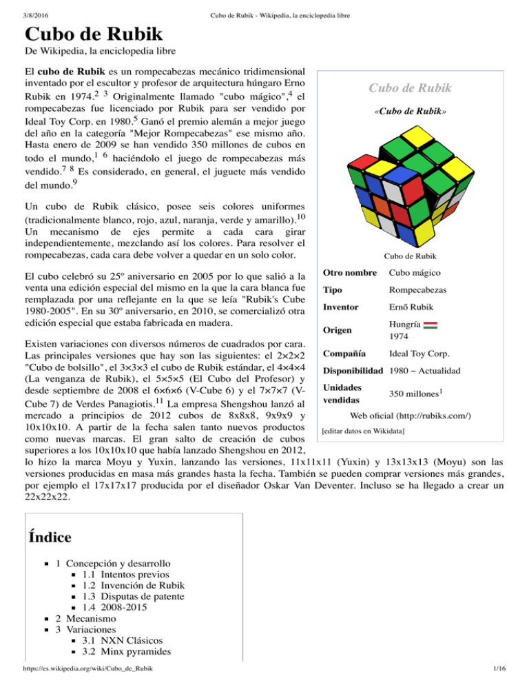 3/8/2016 Cubo de Rubik - Wikipedia, la enciclopedia libre Cubo de Rubik De Wikipedia, la enciclopedia libre El cubo de Rubik es un rompecabezas mecánico tridimensional inventado por el escultor y profesor de arquitectura húngaro Erno Rubik en 1974.2 3 Originalmente llamado "cubo mágico",4 el rompecabezas fue licenciado por Rubik para ser vendido por Ideal Toy Corp. en 1980.5 Ganó el premio alemán a mejor juego del año en la categoría "Mejor Rompecabezas" ese mismo año. Hasta enero de 2009 se han vendido 350 millones de cubos en todo el mundo,1 6 haciéndolo el juego de rompecabezas más vendido.7 8 Es considerado, en general, el juguete más vendido del mundo.9 Cubo de Rubik «Cubo de Rubik» Un cubo de Rubik clásico, posee seis colores uniformes (tradicionalmente blanco, rojo, azul, naranja, verde y amarillo).10 Un mecanismo de ejes permite a cada cara girar independientemente, mezclando así los colores. Para resolver el rompecabezas, cada cara debe volver a quedar en un solo color. El cubo celebró su 25º aniversario en 2005 por lo que salió a la venta una edición especial del mismo en la que la cara blanca fue remplazada por una reflejante en la que se leía "Rubik's Cube 1980-2005". En su 30º aniversario, en 2010, se comercializó otra edición especial que estaba fabricada en madera. Cubo de Rubik Otro nombre Cubo mágico Tipo Rompecabezas Inventor Ernő Rubik Origen Hungría 1974 Existen variaciones con diversos números de cuadrados por cara. Compañía Ideal Toy Corp. Las principales versiones que hay son las siguientes: el 2×2×2 "Cubo de bolsillo", el 3×3×3 el cubo de Rubik estándar, el 4×4×4 Disponibilidad 1980 ~ Actualidad (La venganza de Rubik), el 5×5×5 (El Cubo del Profesor) y Unidades desde septiembre de 2008 el 6×6×6 (V-Cube 6) y el 7×7×7 (V350 millones1 vendidas 11 Cube 7) de Verdes Panagiotis. La empresa Shengshou lanzó al mercado a principios de 2012 cubos de 8x8x8, 9x9x9 y Web oficial (http://rubiks.com/) 10x10x10. A partir de la fecha salen tanto nuevos productos [editar datos en Wikidata] como nuevas marcas. El gran salto de creación de cubos superiores a los 10x10x10 que había lanzado Shengshou en 2012, lo hizo la marca Moyu y Yuxin, lanzando las versiones, 11x11x11 (Yuxin) y 13x13x13 (Moyu) son las versiones producidas en masa más grandes hasta la fecha. También se pueden comprar versiones más grandes, por ejemplo el 17x17x17 producida por el diseñador Oskar Van Deventer. Incluso se ha llegado a crear un 22x22x22. Índice 1 Concepción y desarrollo 1.1 Intentos previos 1.2 Invención de Rubik 1.3 Disputas de patente 1.4 2008-2015 2 Mecanismo 3 Variaciones 3.1 NXN Clásicos 3.2 Minx pyramides 3.3 Minx dodecaedros https://es.wikipedia.org/wiki/Cubo_de_Rubik 1/16 3/8/2016 Cubo de Rubik - Wikipedia, la enciclopedia libre 3.3 Minx dodecaedros 4 Matemática 4.1 Permutaciones 4.2 Caras centrales 4.3 Algoritmos 5 Soluciones 5.1 Notación 5.2 Soluciones óptimas 6 Competiciones y plusmarcas 6.1 Competiciones de speedcubing 6.2 Plusmarcas 7 Variaciones 7.1 Variaciones extra dimensionales 8 En la cultura popular 8.1 Arte 9 Referencias 10 Bibliografía 11 Enlaces externos Concepción y desarrollo Intentos previos En marzo de 1970, Larry Nichols inventó un rompecabezas con piezas rotables en grupos de 2×2×2 y presentó una solicitud de patente canadiense. El juguete de Nichols se sostenía usando imanes. A Nichols se le otorgó una patente estadounidense (3655201) el 11 de abril de 1972, dos años antes de que Rubik inventara su cubo.[cita requerida] Un cubo de Rubik resuelto y uno sin resolver. El 9 de abril de 1970 Frank Fox patentó su 3×3×3 esférico. Recibió una patente del Reino Unido (1344259) el 16 de enero de 1974.[cita requerida] Invención de Rubik A mediados de la década de 1970, Ernő Rubik trabajaba en el Departamento de Diseño de Interiores en la Academia de Artes y Trabajos Manuales Aplicados en Budapest.12 Aunque generalmente se dice que el cubo fue construido como herramienta escolar para ayudar a sus estudiantes a entender objetos tridimensionales, su propósito real era resolver el problema estructural que lograra mover las partes independientemente sin que el mecanismo entero se desmoronara. Rubik no se dio cuenta de que había creado un rompecabezas hasta la primera vez que mezcló su nuevo cubo e intentó volverlo a la posición original.13 Obtuvo una patente húngara (HU170062) en 1975. Originalmente, el cubo de Rubik fue llamado Cubo Mágico (Bűvös kocka) en Hungría.14 El rompecabezas no había sido patentado internacionalmente en el plazo de un año de la patente original. De esta manera, la ley de patentes impedía la posibilidad de patentarlo a nivel internacional. Ideal quería al menos un nombre reconocible para registrar; el acuerdo puso a Rubik en el centro de atención debido a que el cubo mágico fue renombrado como su inventor. https://es.wikipedia.org/wiki/Cubo_de_Rubik Envase del cubo de Rubik, juguete del año de 1980. Ideal Toy Corp., hecho en Hungría. 2/16 3/8/2016 Cubo de Rubik - Wikipedia, la enciclopedia libre Los primeros productos de este invento salieron a la venta a finales de 1977 en jugueterías de Budapest. El cubo mágico se unía por medio de piezas de plástico ensambladas entre sí que prevenían que las piezas se separaran, a diferencia de los imanes en el diseño de Nichols. En septiembre de 1979 se firmó un acuerdo con Ideal para vender el cubo mágico a nivel mundial y el rompecabezas hizo su debut internacional en ferias de juguetes de Londres, París, Nürnberg y Nueva York en enero y febrero de 1980. Después del éxito internacional del Cubo Rubik en las jugueterías occidentales se detuvo brevemente para que el juguete pudiera adecuarse a los estándares occidentales de seguridad y empaquetado. Se produjo un cubo más ligero e Ideal, Toys decidió cambiarle el nombre; se consideraron "El nudo gordiano" y "Oro Inca", pero la compañía finalmente se decidió por "El cub
