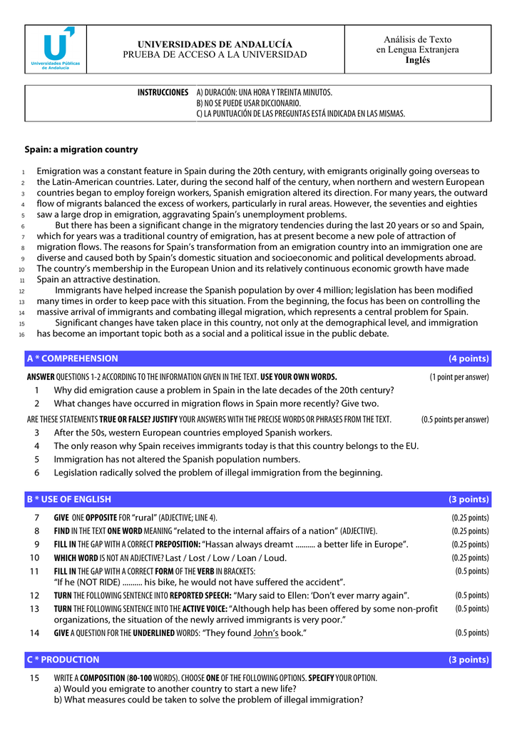 UNIVERSIDADES DE ANDALUCÍA PRUEBA DE ACCESO A LA UNIVERSIDAD Análisis de Texto en Lengua Extranjera Inglés INSTRUCCIONES A) DURACIÓN: UNA HORA Y TREINTA MINUTOS. B) NO SE PUEDE USAR DICCIONARIO. C) LA PUNTUACIÓN DE LAS PREGUNTAS ESTÁ INDICADA EN LAS MISMAS. Spain: a migration country 1 2 3 4 5 6 7 8 9 10 11 12 13 14 15 16 Emigration was a constant feature in Spain during the 20th century, with emigrants originally going overseas to the Latin-American countries. Later, during the second half of the century, when northern and western European countries began to employ foreign workers, Spanish emigration altered its direction. For many years, the outward flow of migrants balanced the excess of workers, particularly in rural areas. However, the seventies and eighties saw a large drop in emigration, aggravating Spain’s unemployment problems. But there has been a significant change in the migratory tendencies during the last 20 years or so and Spain, which for years was a traditional country of emigration, has at present become a new pole of attraction of migration flows. The reasons for Spain’s transformation from an emigration country into an immigration one are diverse and caused both by Spain’s domestic situation and socioeconomic and political developments abroad. The country’s membership in the European Union and its relatively continuous economic growth have made Spain an attractive destination. Immigrants have helped increase the Spanish population by over 4 million; legislation has been modified many times in order to keep pace with this situation. From the beginning, the focus has been on controlling the massive arrival of immigrants and combating illegal migration, which represents a central problem for Spain. Significant changes have taken place in this country, not only at the demographical level, and immigration has become an important topic both as a social and a political issue in the public debate. A * COMPREHENSION ANSWER QUESTIONS 1-2 ACCORDING TO THE INFORMATION GIVEN IN THE TEXT. USE YOUR OWN WORDS. 1 Why did emigration cause a problem in Spain in the late decades of the 20th century? 2 What changes have occurred in migration flows in Spain more recently? Give two. (4 points) (1 point per answer) ARE THESE STATEMENTS TRUE OR FALSE? JUSTIFY YOUR ANSWERS WITH THE PRECISE WORDS OR PHRASES FROM THE TEXT. (0.5 points per answer) 3 After the 50s, western European countries employed Spanish workers. 4 The only reason why Spain receives immigrants today is that this country belongs to the EU. 5 Immigration has not altered the Spanish population numbers. 6 Legislation radically solved the problem of illegal immigration from the beginning. B * USE OF ENGLISH 7 8 9 10 11 12 13 14 GIVE ONE OPPOSITE FOR “rural” (ADJECTIVE; LINE 4). FIND IN THE TEXT ONE WORD MEANING “related to the internal affairs of a nation” (ADJECTIVE). FILL IN THE GAP WITH A CORRECT PREPOSITION: “Hassan always dreamt .......... a better life in Europe”. WHICH WORD IS NOT AN ADJECTIVE? Last / Lost / Low / Loan / Loud. FILL IN THE GAP WITH A CORRECT FORM OF THE VERB IN BRACKETS: “If he (NOT RIDE) .......... his bike, he would not have suffered the accident”. TURN THE FOLLOWING SENTENCE INTO REPORTED SPEECH: “Mary said to Ellen: ‘Don’t ever marry again”. TURN THE FOLLOWING SENTENCE INTO THE ACTIVE VOICE: “Although help has been offered by some non-profit organizations, the situation of the newly arrived immigrants is very poor.” GIVE A QUESTION FOR THE UNDERLINED WORDS: “They found John’s book.” C * PRODUCTION 15 WRITE A COMPOSITION (80-100 WORDS). CHOOSE ONE OF THE FOLLOWING OPTIONS. SPECIFY YOUR OPTION. a) Would you emigrate to another country to start a new life? b) What measures could be taken to solve the problem of illegal immigration? (3 points) (0.25 points) (0.25 points) (0.25 points) (0.25 points) (0.5 points) (0.5 points) (0.5 points) (0.5 points) (3 points) UNIVERSIDADES DE ANDALUCÍA PRUEBA DE ACCESO A LA UNIVERSIDAD Análisis de Texto en Lengua Extranjera Inglés Criterios de corrección Sección A * COMPREHENSION (4 puntos). Esta sección se estructura en dos apartados: (A1) Cada una de las dos primeras preguntas vale 1 punto, del que 0,5 corresponde a la comprensión y 0,5 a expresión, calificadas con 0,50; 0,25; 0, dependiendo del grado de adecuación. En caso de que se responda acertadamente pero copiando literalmente del texto, se obtendrá 0,5 puntos en comprensión y 0 puntos en corrección gramatical, por no haber habido una producción propia. Si no se demostrara comprensión, la puntuación de la respuesta será 0. Por tanto, la puntuación total de cada pregunta puede ser 1; 0,75; 0,50; 0,25; 0. (Puntuación total del apartado: 2 puntos) (A2) En las cuatro preguntas del tipo verdadero/falso, en las que el/la estudiante deberá justificar con exactitud su respuesta según el texto, se valora exclusivamente la comprensión y no la expresión. Cada una de las preguntas vale 0,5 absoluto, y si no se justifica la respuesta, la puntuación será 0. Se considerará válida la respuesta que copie la parte exacta del texto donde aparezca la información relevante, o cualquier otra que ofrezca dicha información con las palabras propias del/de la alumno/a. Sólo se admitirán puntos suspensivos si acotan de forma precisa el comienzo y el final de la parte exacta del texto. Dar sólo el número de línea no será aceptado como justificación. (Puntuación total del apartado: 2 puntos) Sección B * USE OF ENGLISH (3 puntos). Las preguntas de léxico serán puntuadas con 0,25 absoluto, o nada, sin gradación posible. En caso de dar más de una respuesta, sólo se considerará la primera de ellas. La puntuación de las preguntas de gramática será de esta manera: - La respuesta es correcta y no presenta ningún error: 0,5 puntos. - La respuesta es correcta, pero tiene algún error: 0,25 puntos. - No se responde a lo que expresamente se pide: 0 puntos. El con